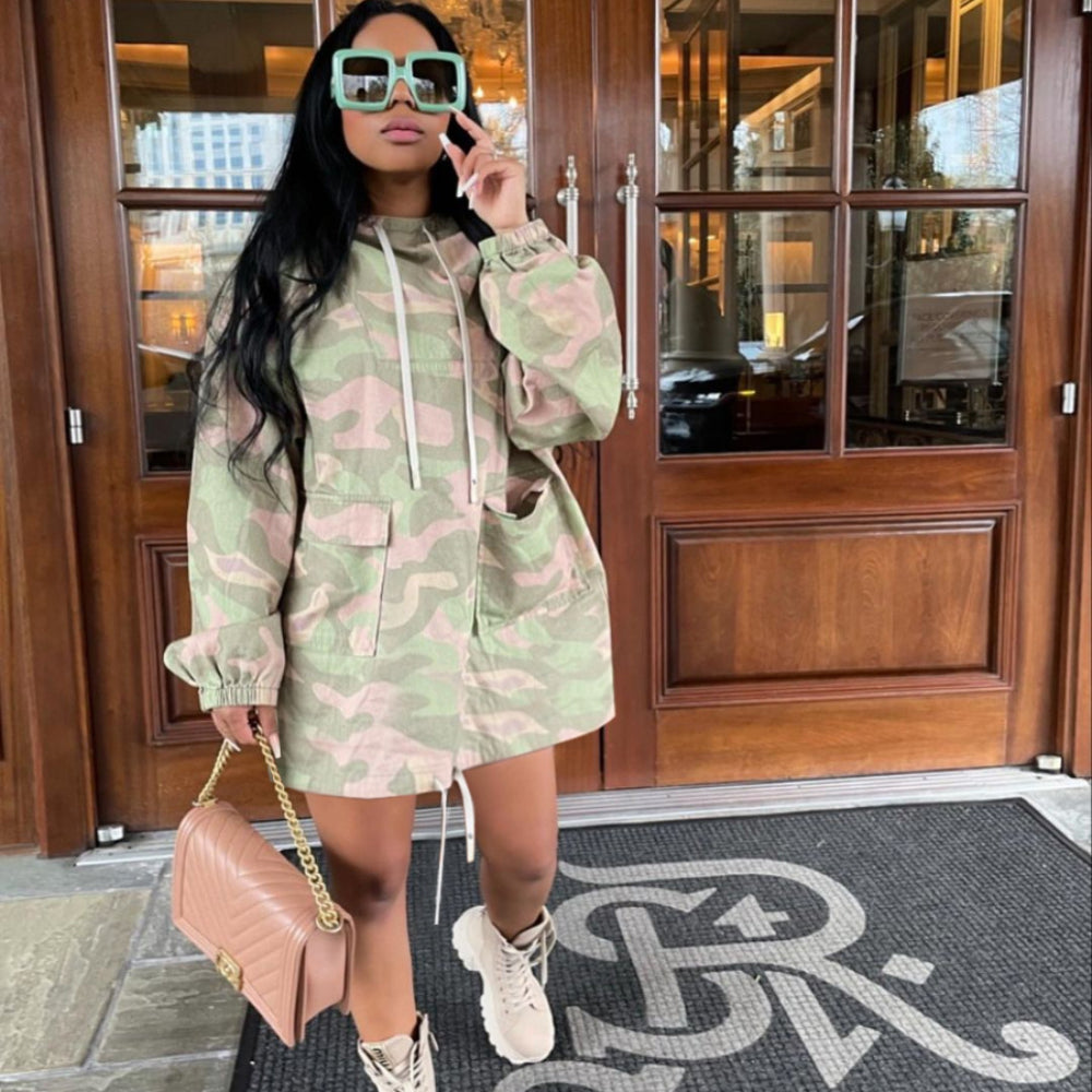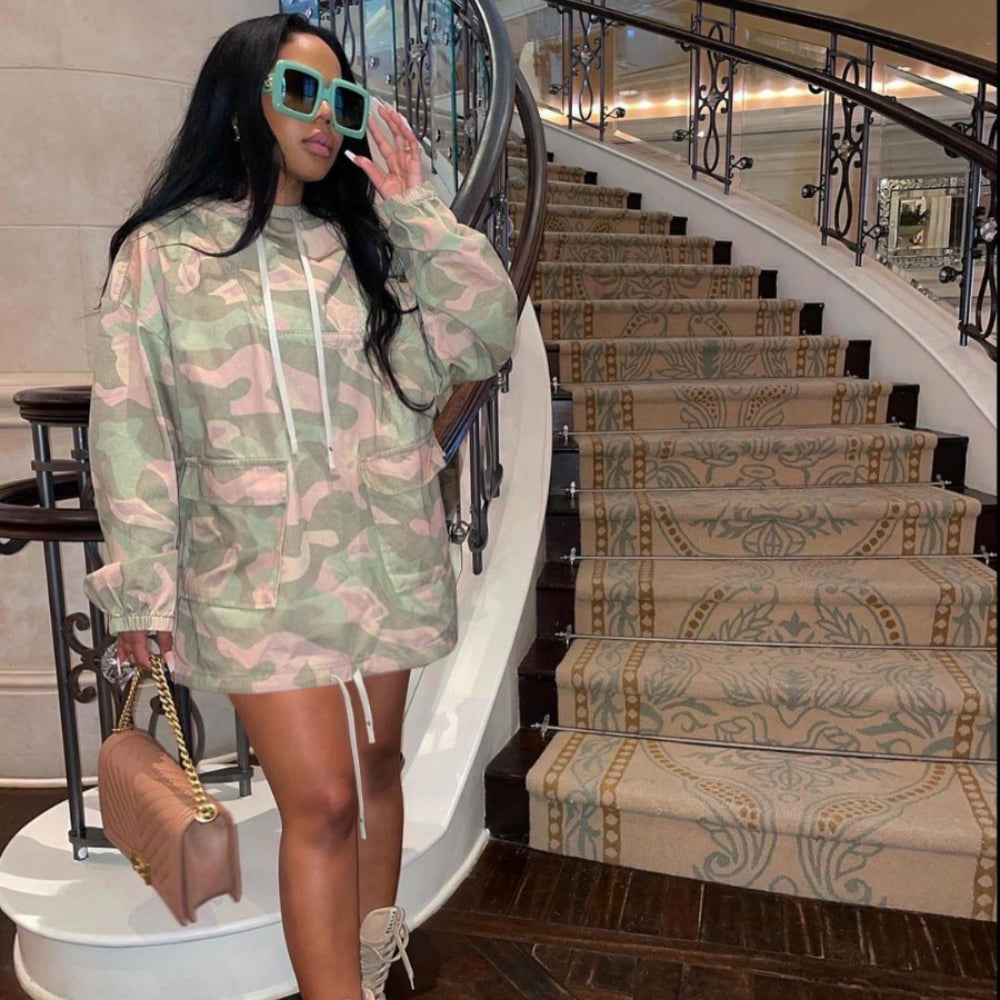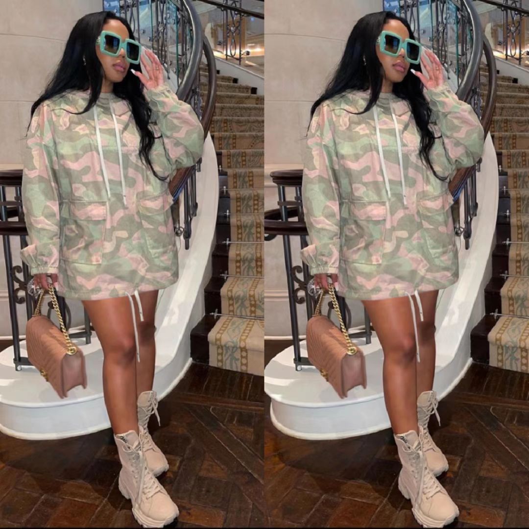 Camouflage Pocket Hooded Drawstring Dress(CL11010)