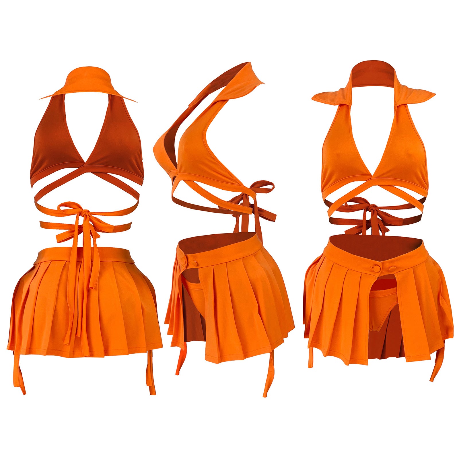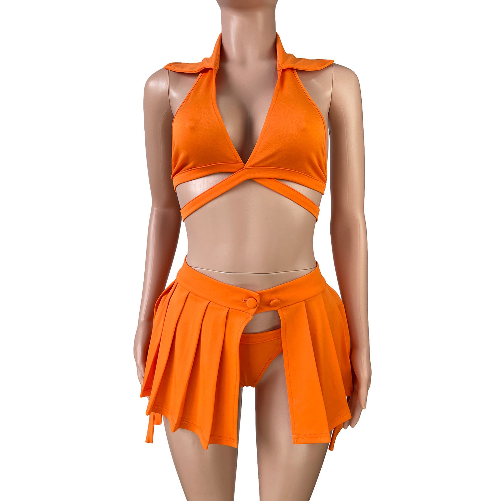 Lapel Halter Bikini Pleated Skirt Sports Swimsuit 3pc Set (CL11621)