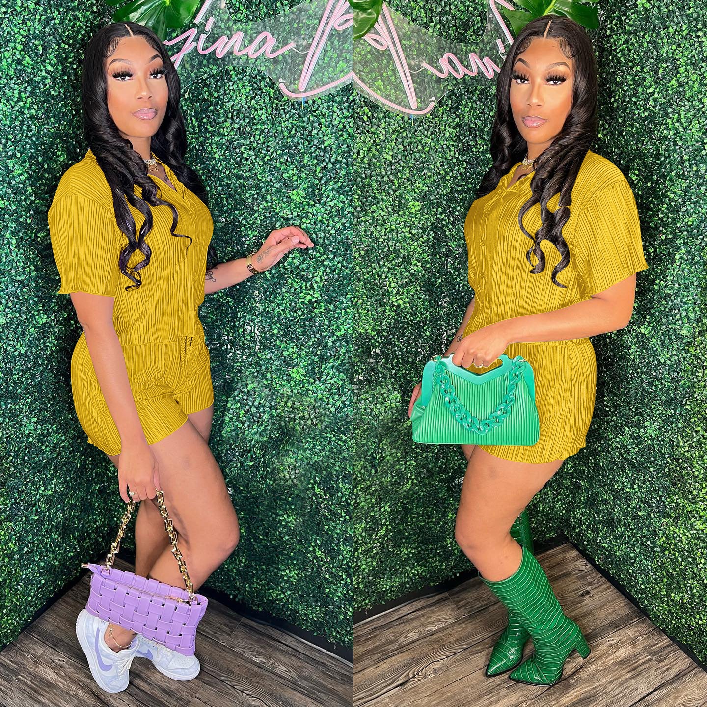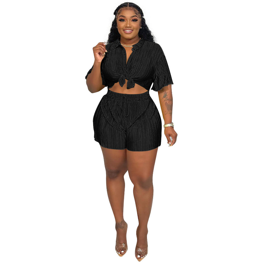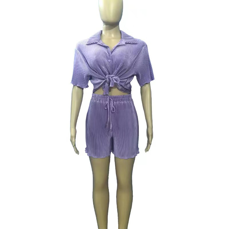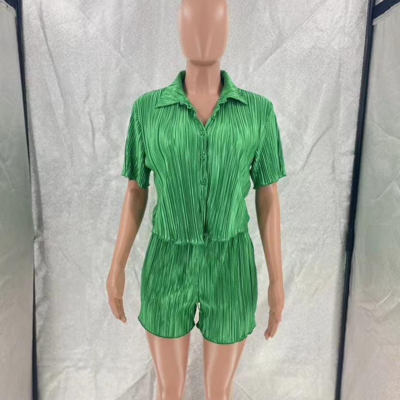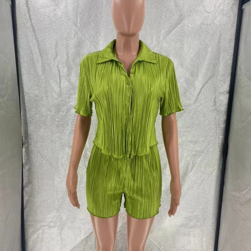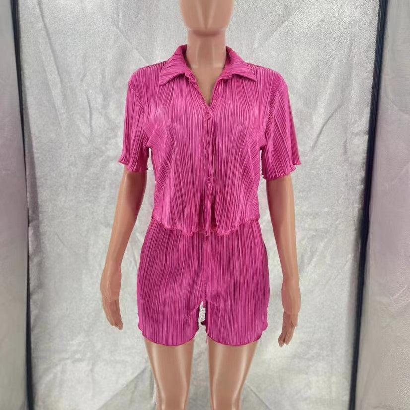 Lapel Pleated Shorts Short Sleeve Two-Piece Suit(CL11566)
