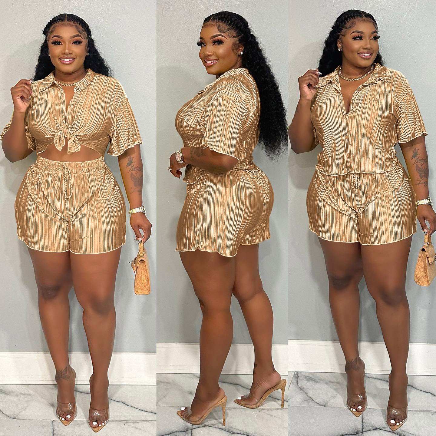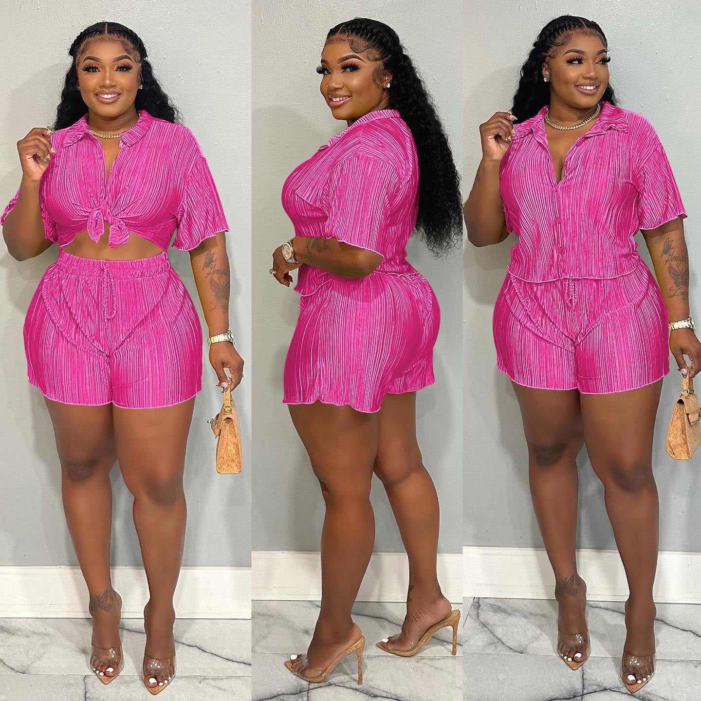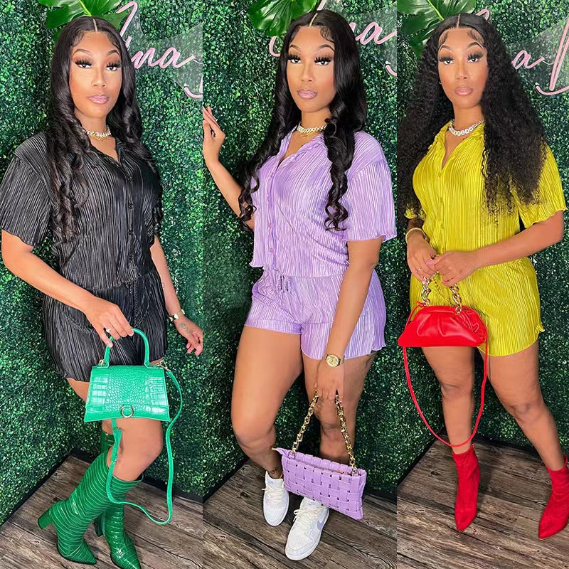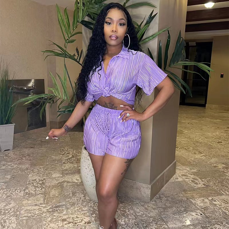 Lapel Pleated Shorts Short Sleeve Two-Piece Suit(CL11566)