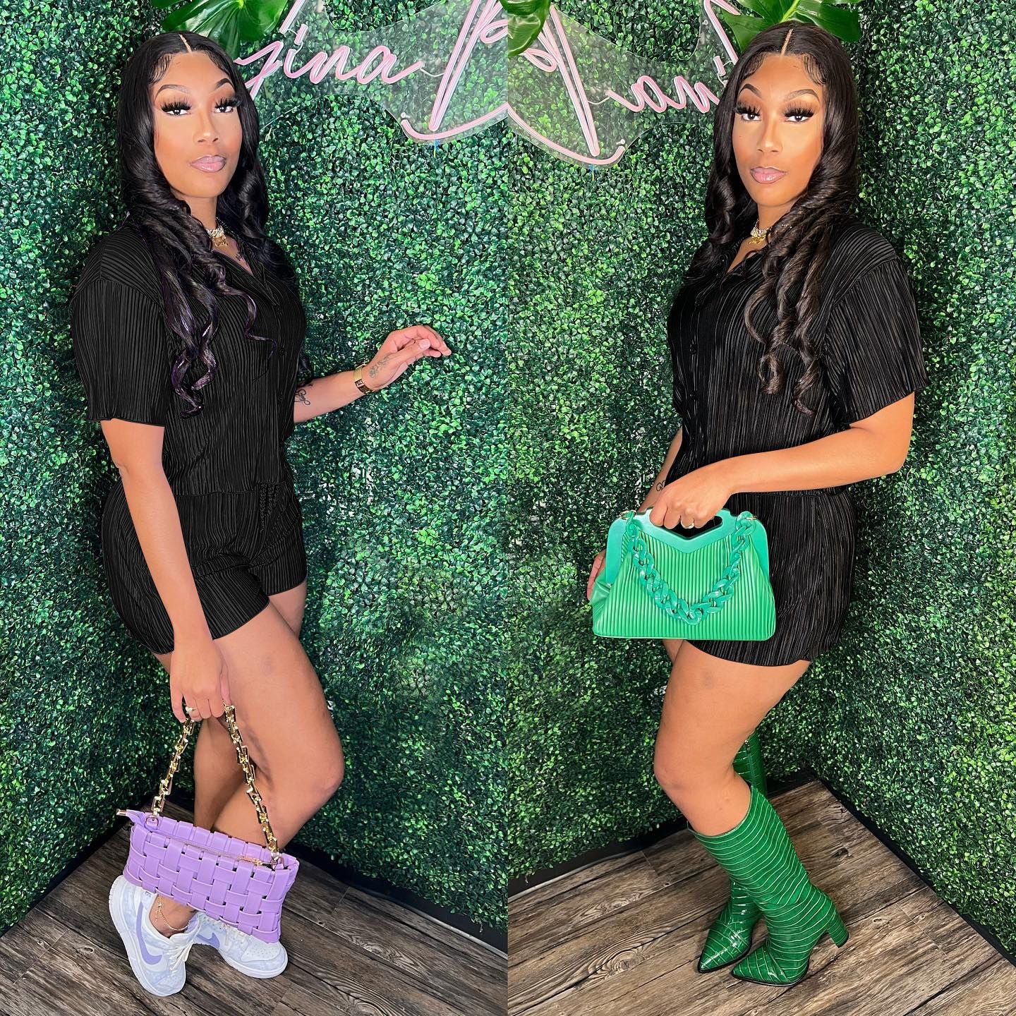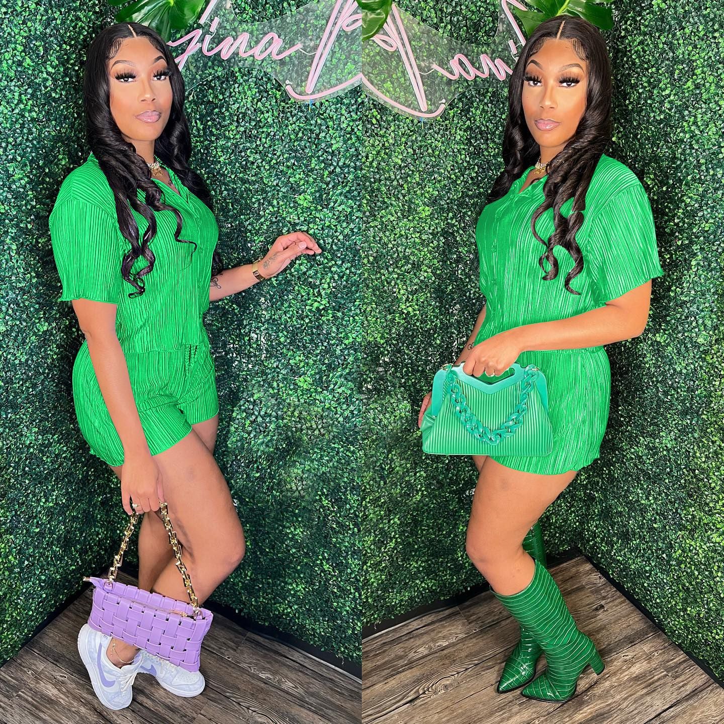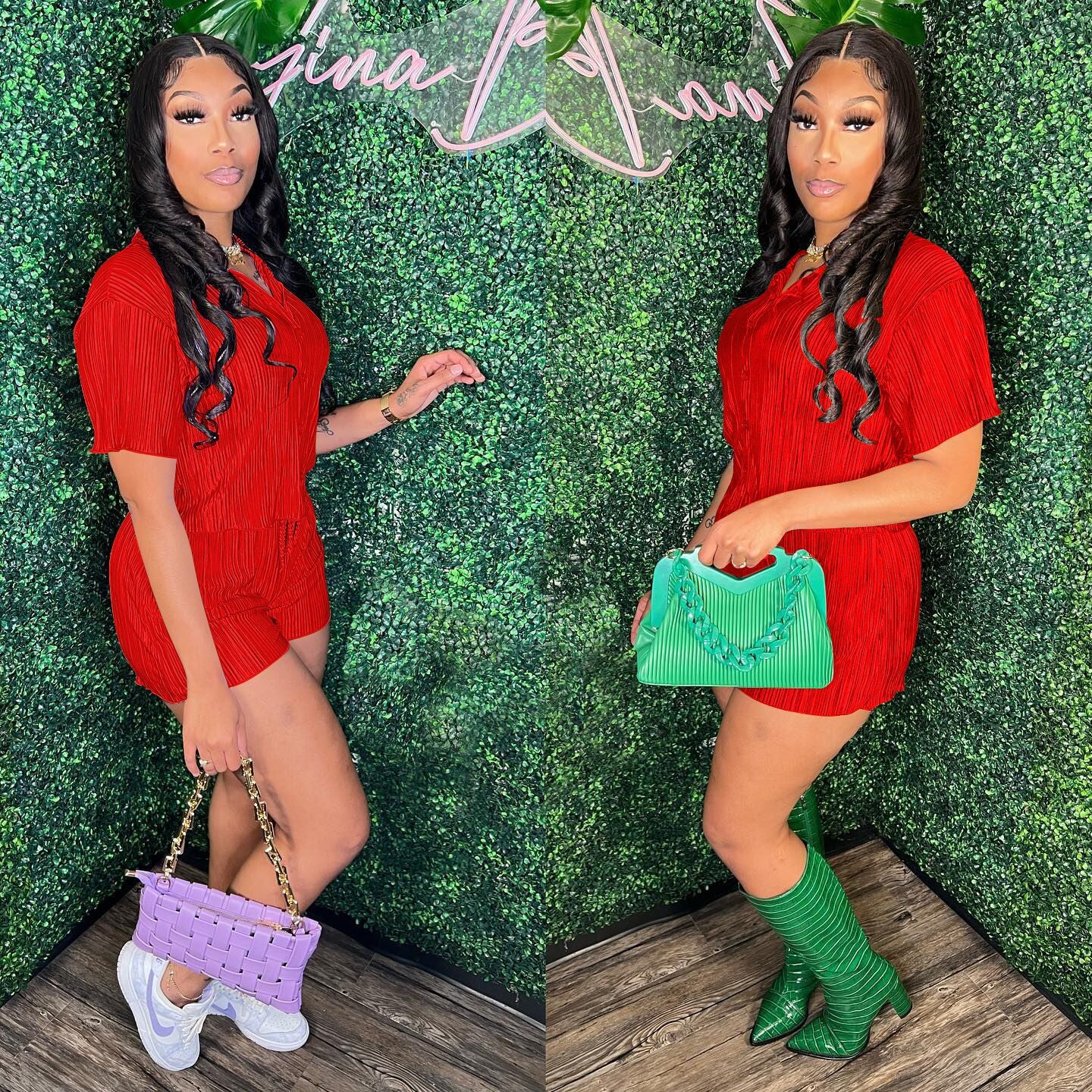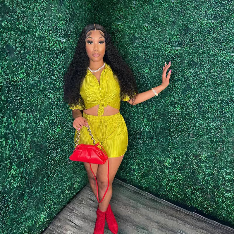 Lapel Pleated Shorts Short Sleeve Two-Piece Suit(CL11566)