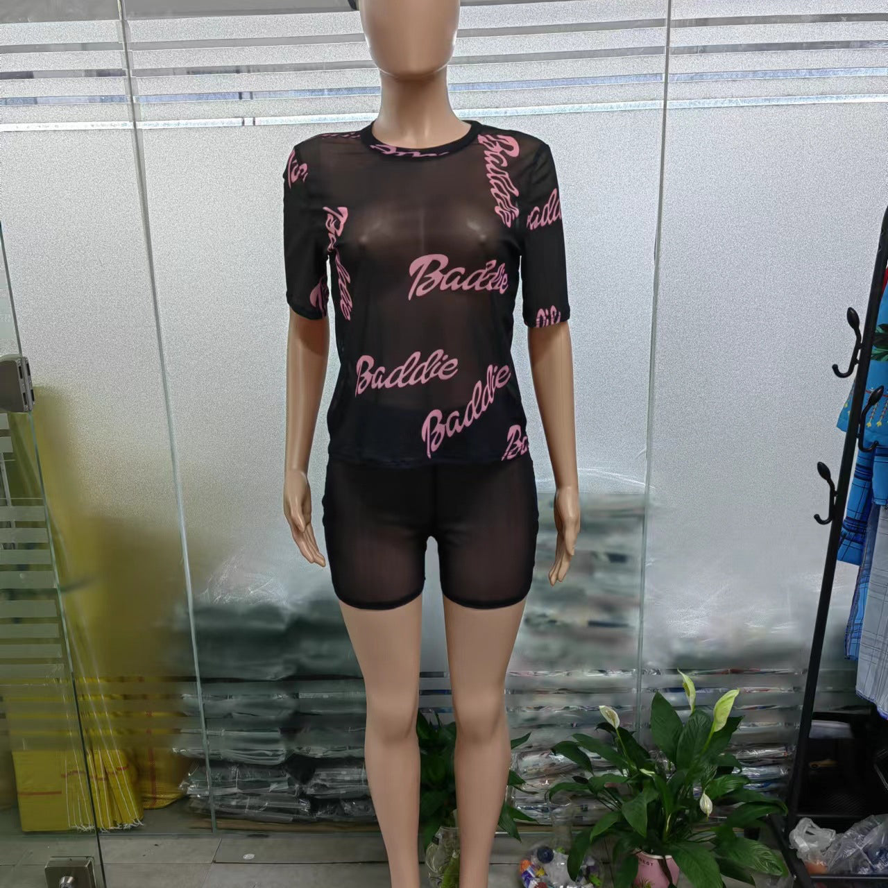 Letter Printing See-through Short-Sleeved Shorts Two-Piece Set (CL10183)