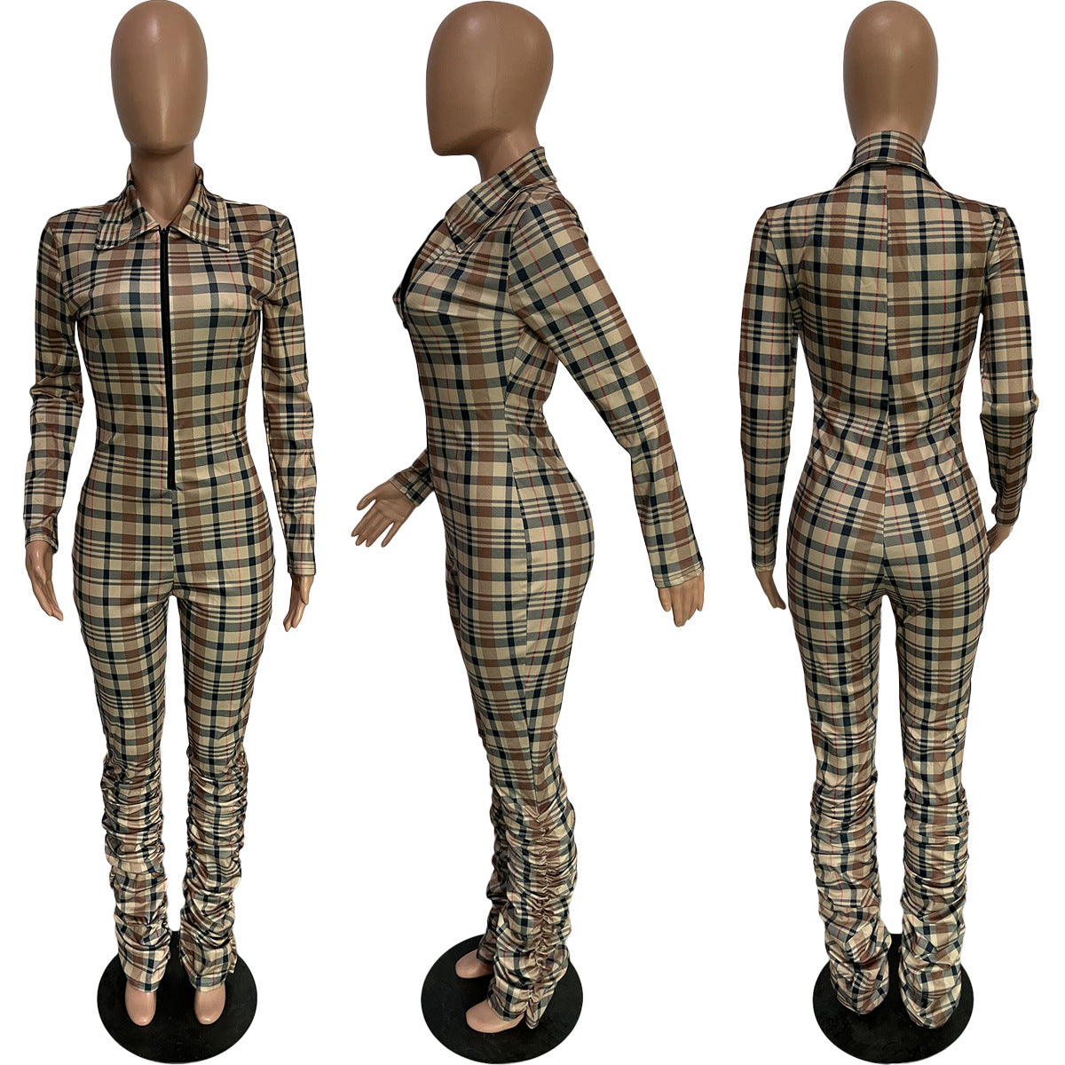 New V-neck Plaid Zipper Wrinkle Jumpsuit (CL9843)