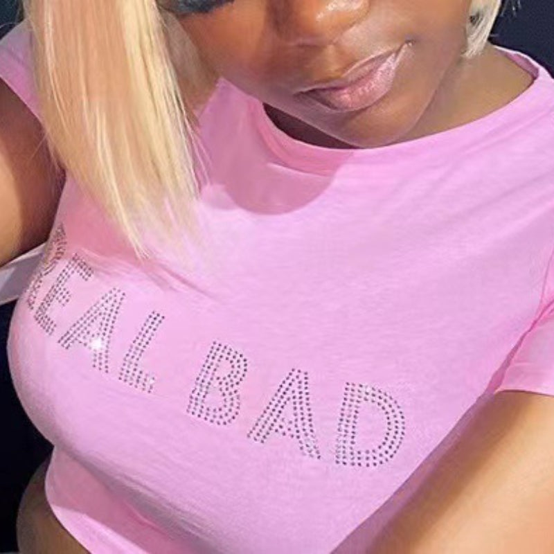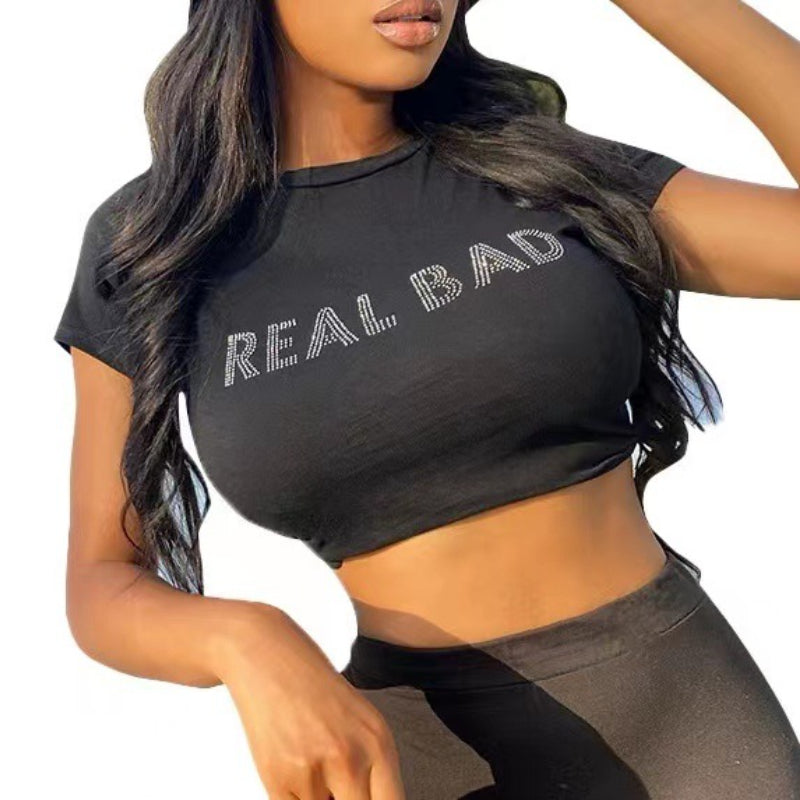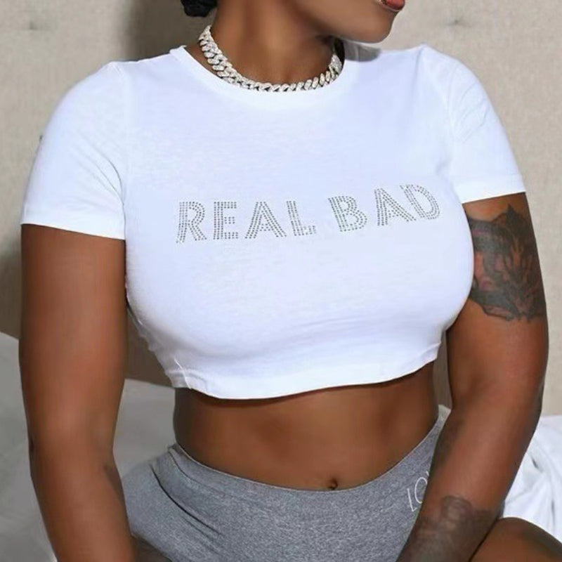 Rhinestone round Neck Midriff-Baring Tight T-shirt(CL11432)