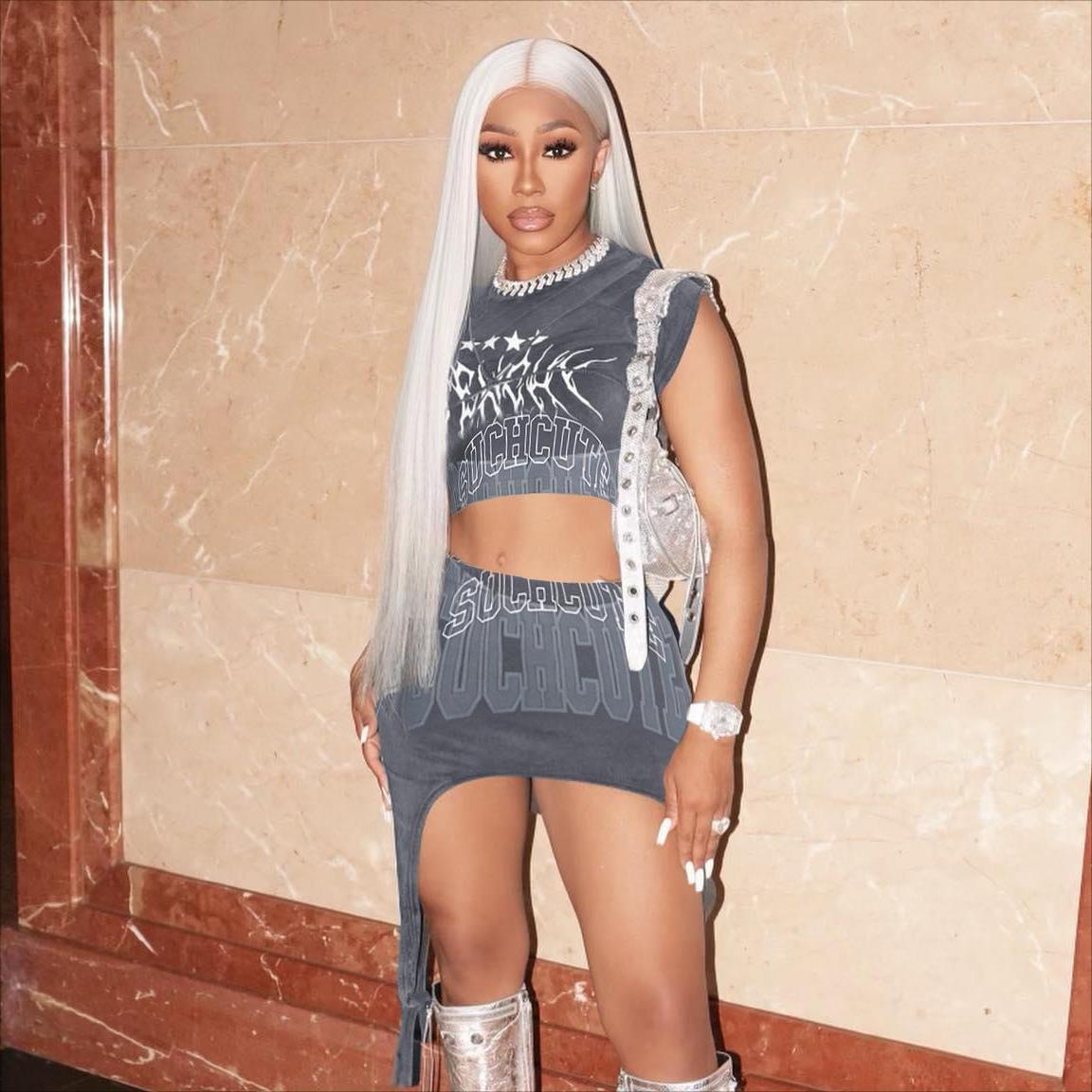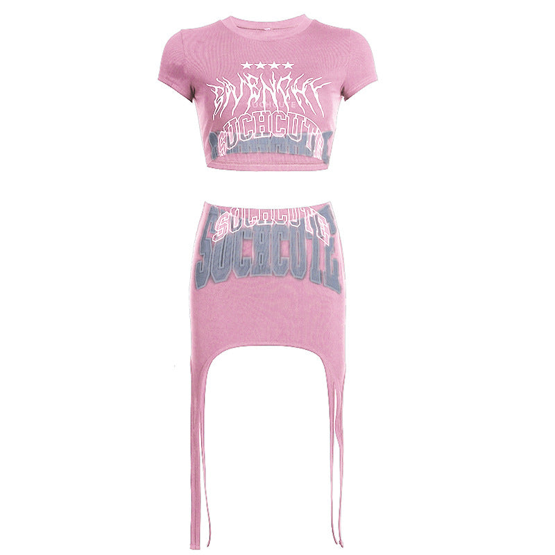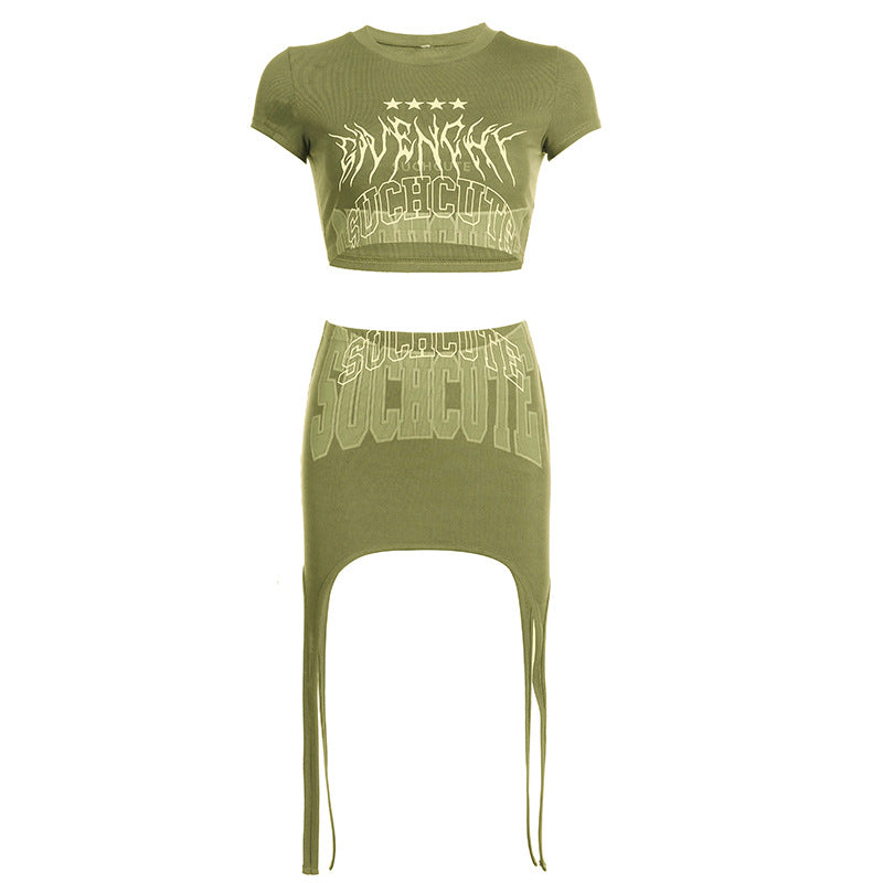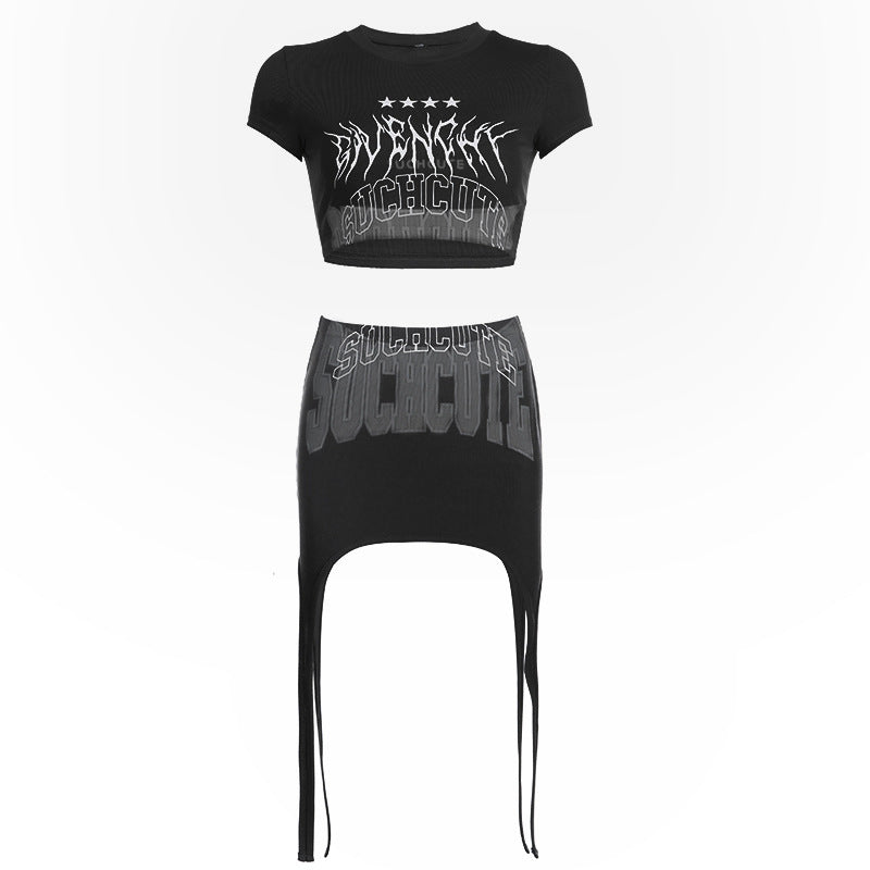Sexy Bare Midriff Slim Fit T-shirt Irregular Skirt Letters printing 2PC set (CL11370)
