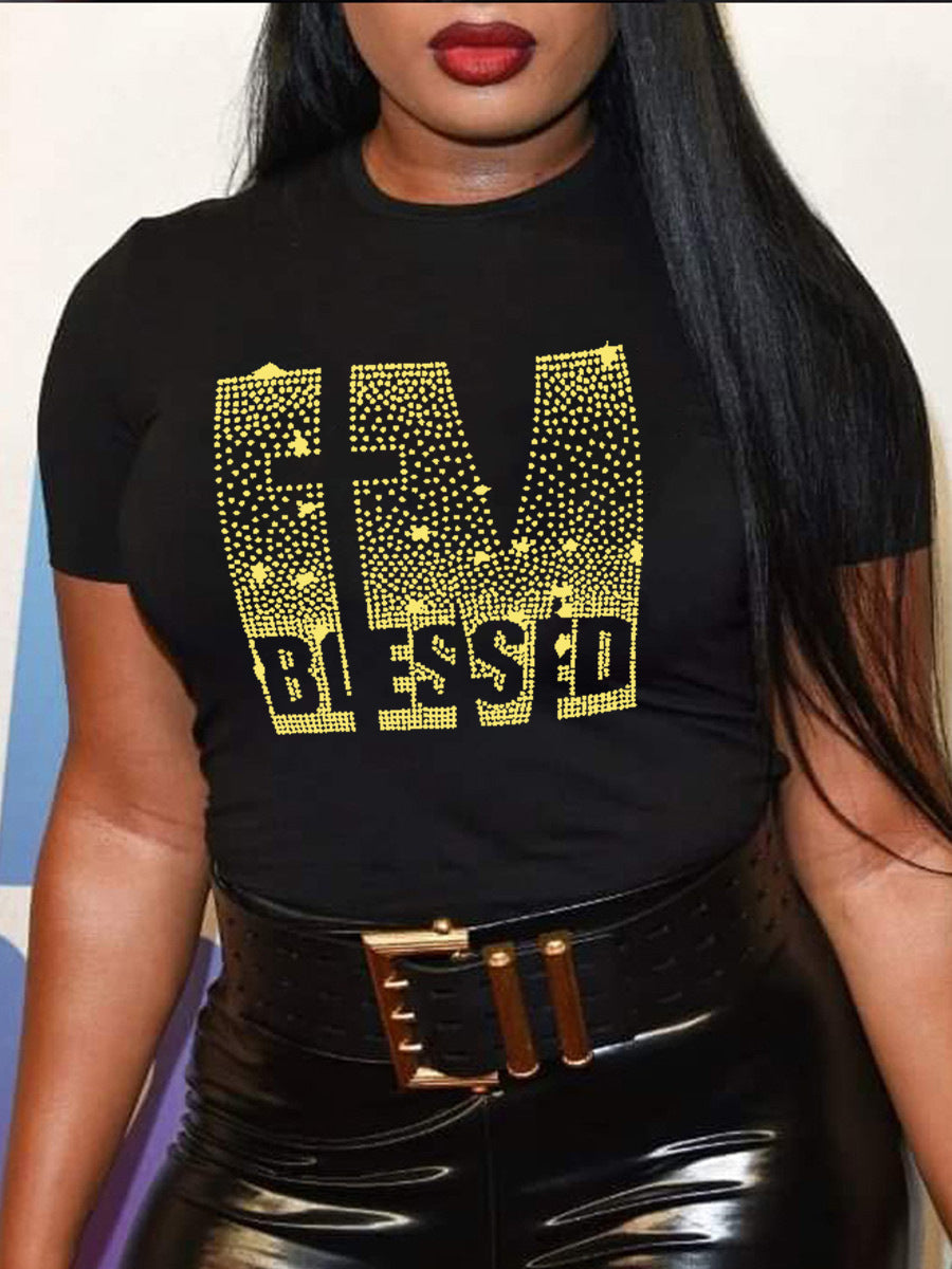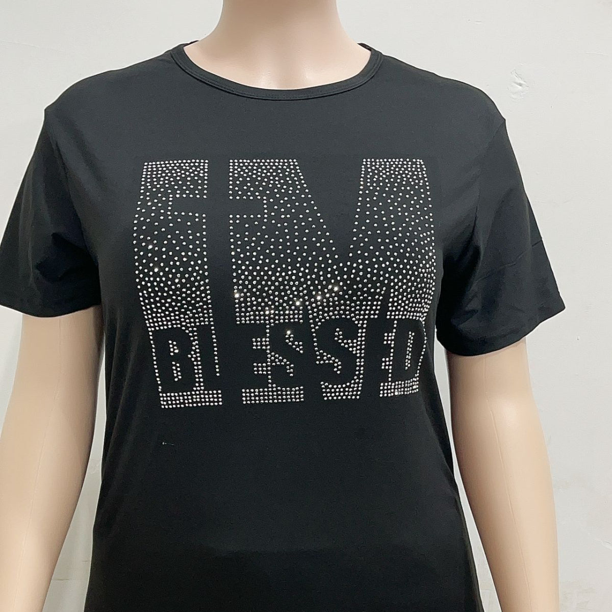 Solid Color Letter Rhinestone round Neck Top (CL10432)