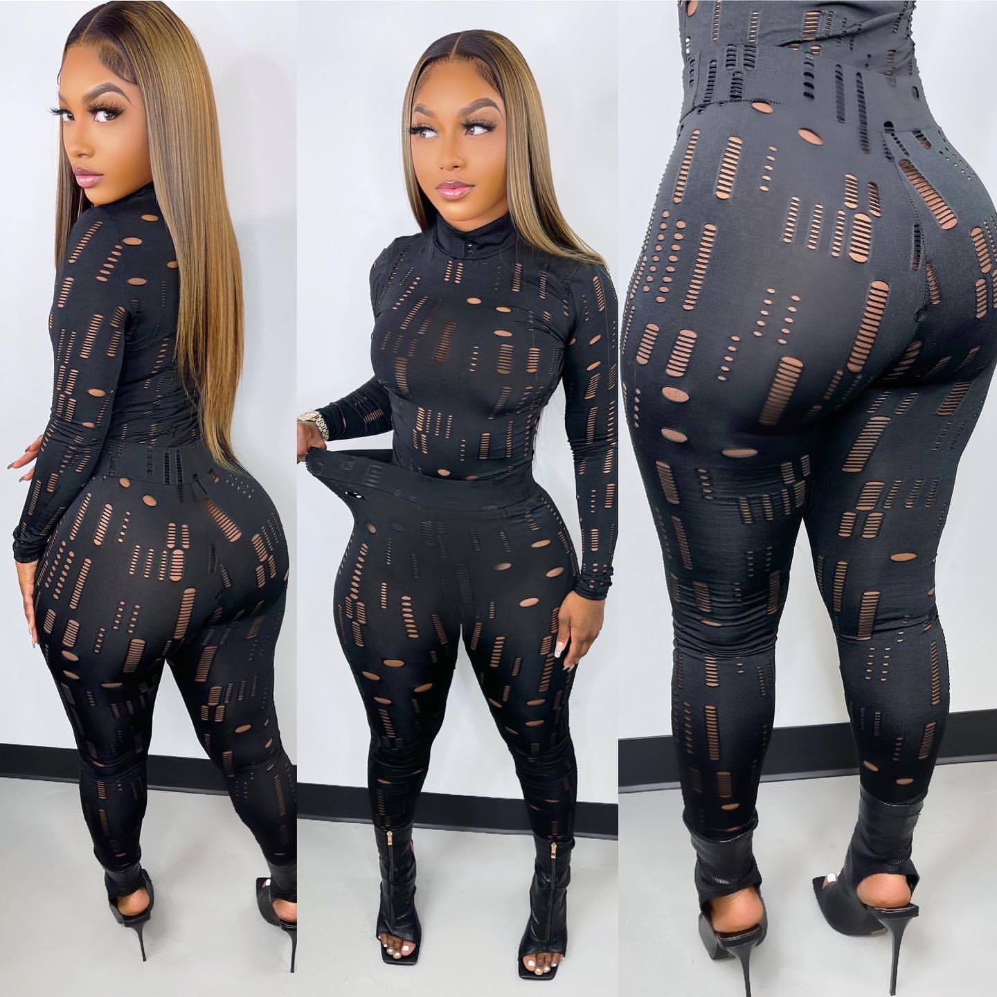 Wholesale hole high collar long sleeve jacket small foot trouser set(CL9794)