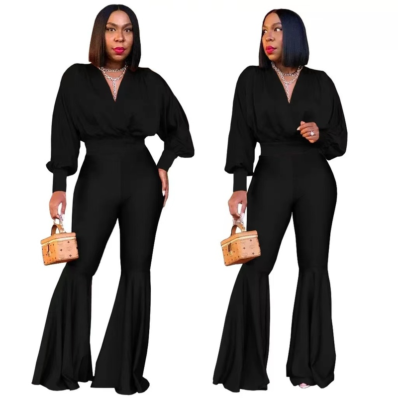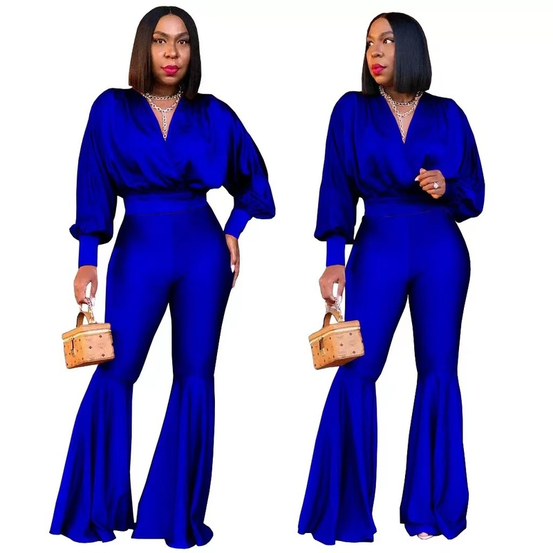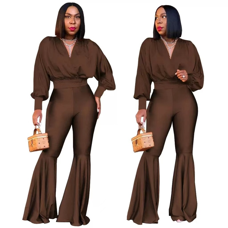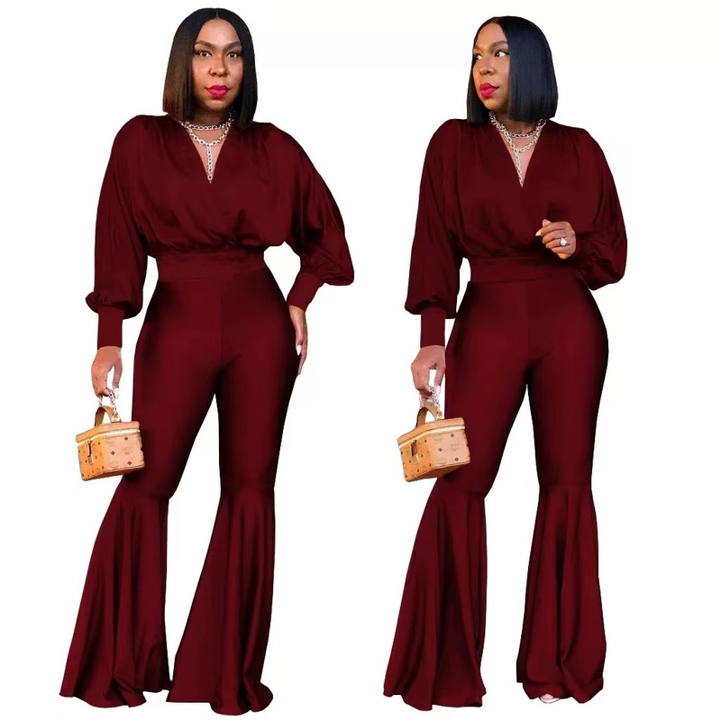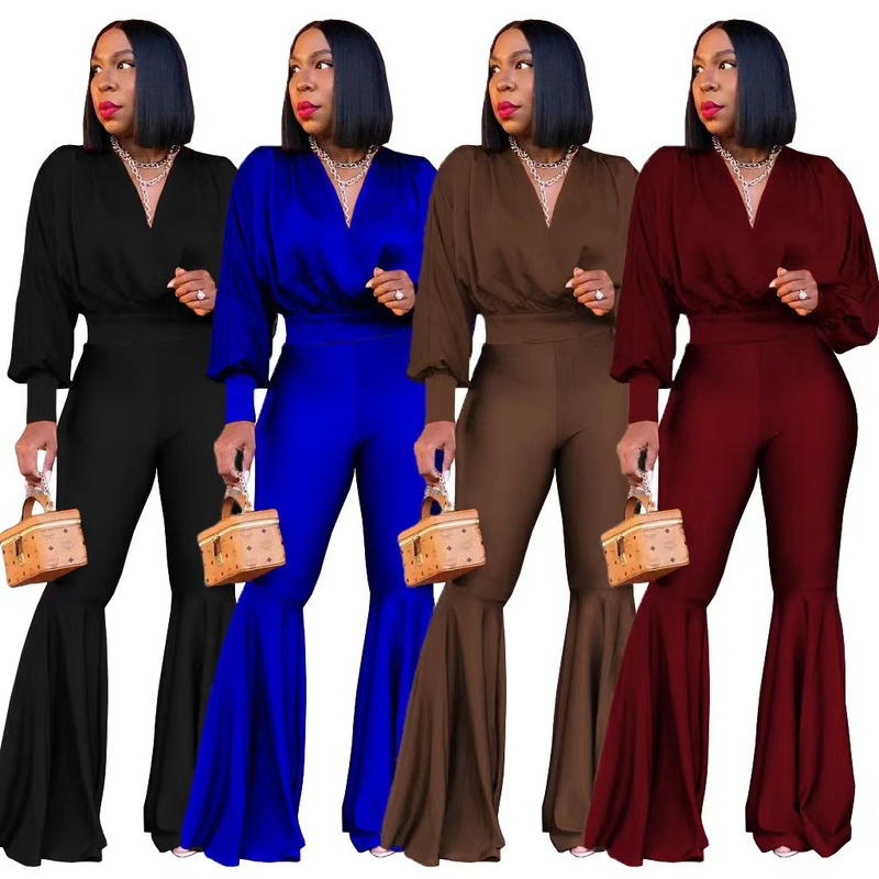 Wholesale solid color sexy V-neck coat flare Pants 2pcs Set(CL9672)