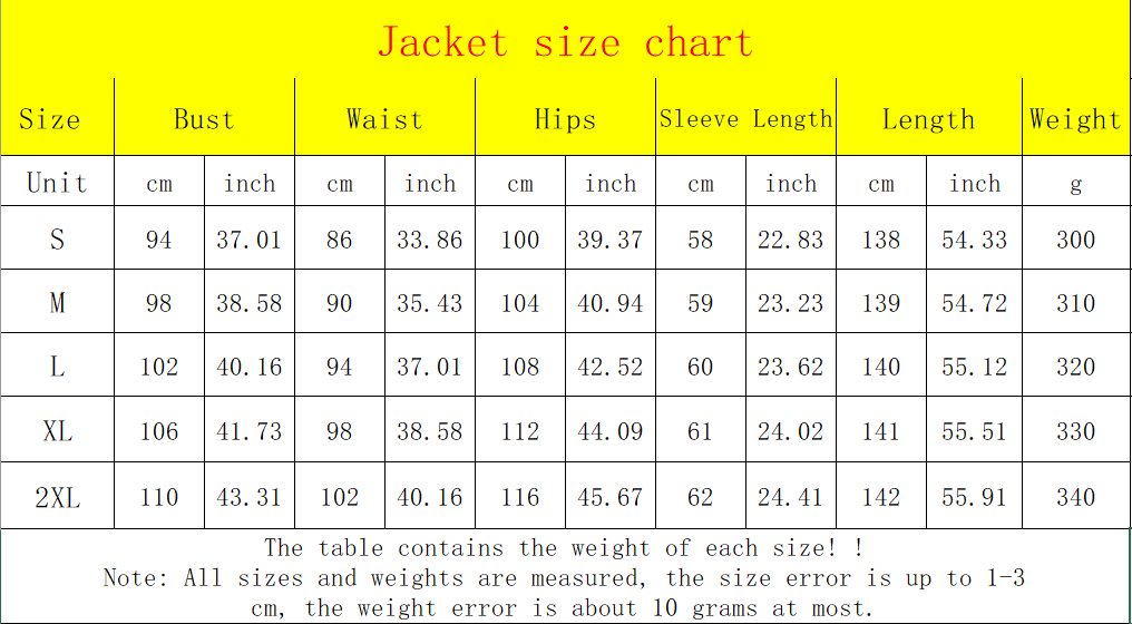 Size chart(in) Size Bust Waist Hips Sleeve Length S 37.10 33.86 39.37 22.82 54.33 M 38.58 35.43 40.94 23.23 54.73 L 40.16 37.01 42.52 23.62 55.12 XL 41.73 38.58 44.09 24.02 55.51 2XL 43.31 40.16 45.67 24.41 55.91 Due to different measurement methods, the size data may have an error of 1-3 cm.