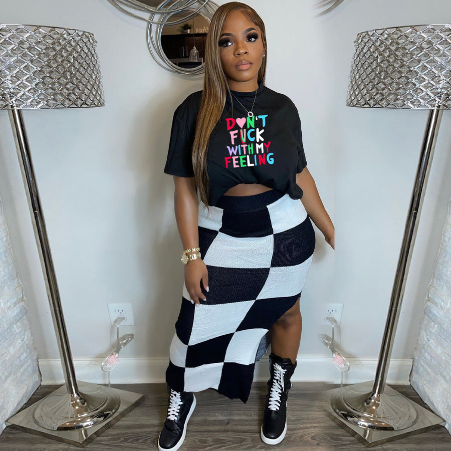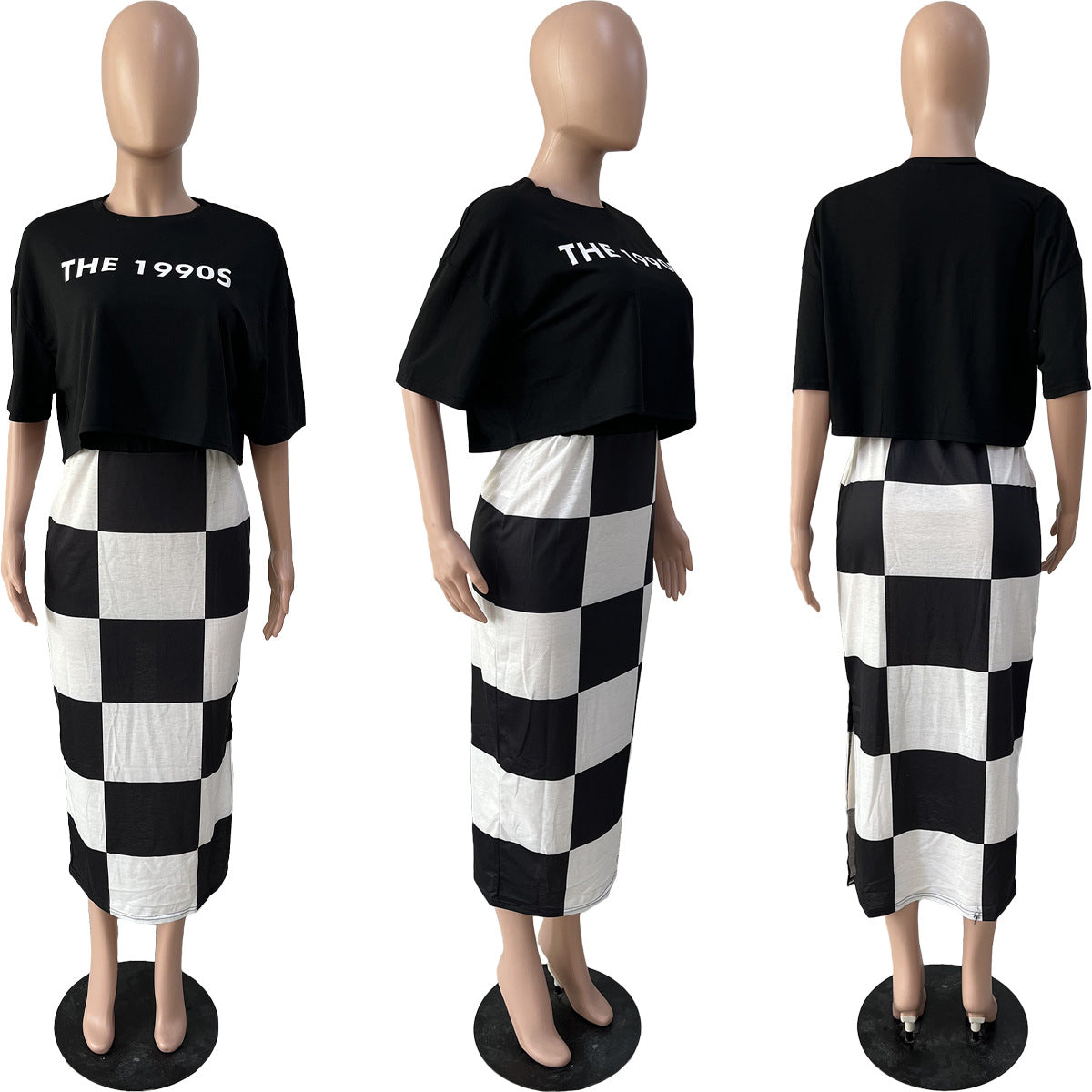 Black and White Checkered Printed Two-piece Long Skirt (CL11482)