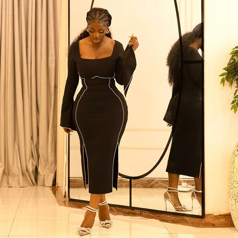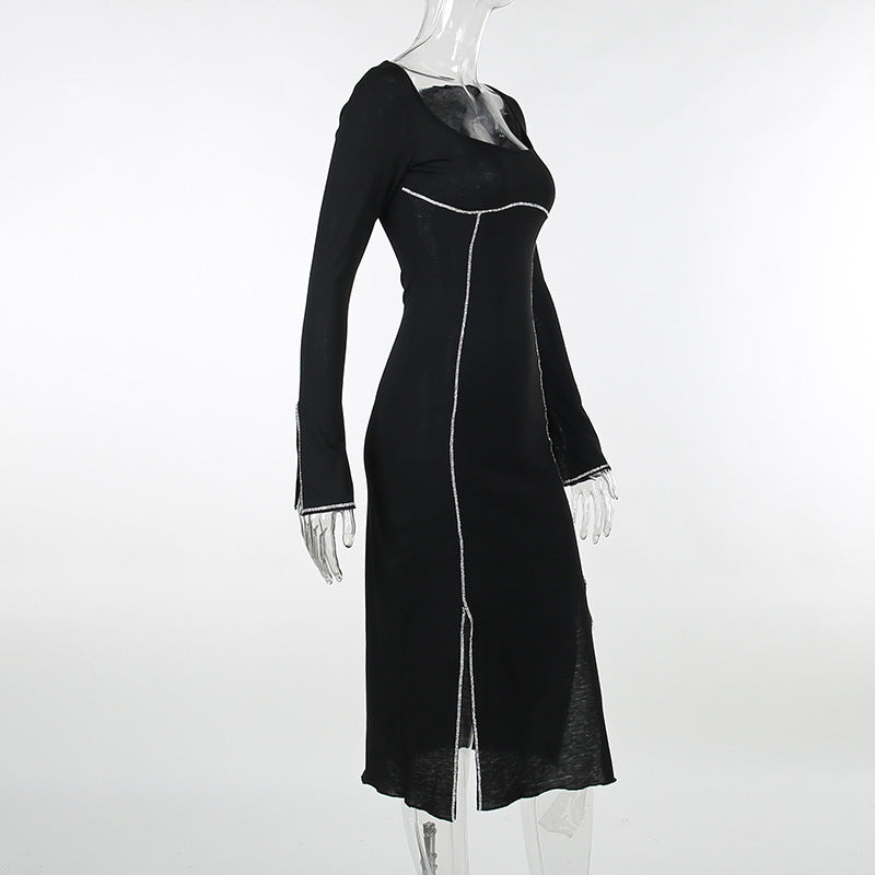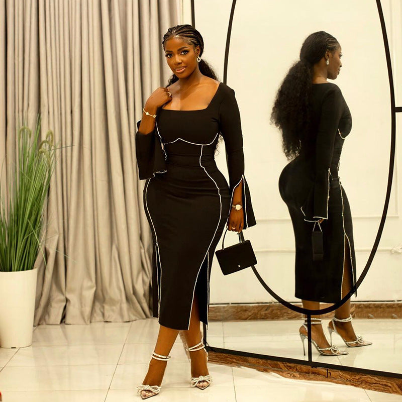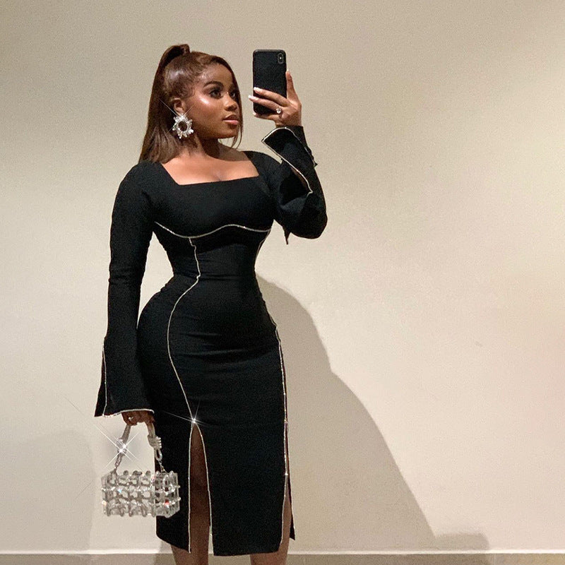 Knitted Long Sleeve Sexy Split Hot Diamond Slim Fit Dress(CL12031)