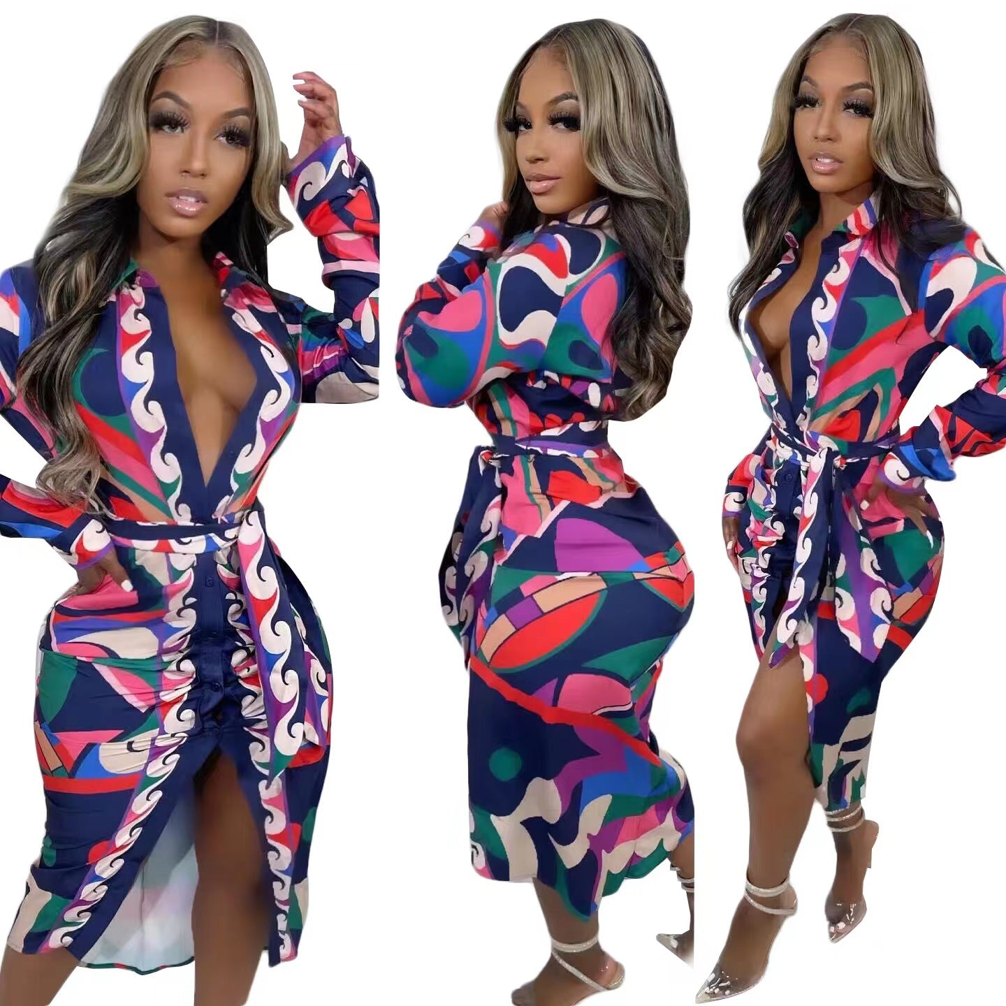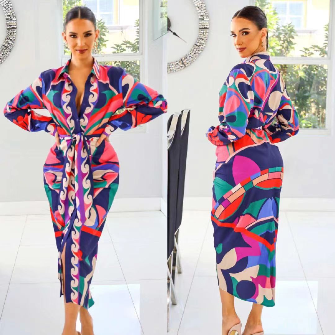 Lapel Waist Long Sleeve Painted Shirt Skirt (Including Belt)(CL11215)