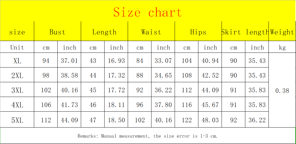 Size chart(in) Size Bust Length Waist Hip Skirt XL 37.01 16.93 33.70 40.94 35.43 2XL 38.58 17.32 34.65 42.52 35.43 3XL 40.16 17.72 36.22 44.09 35.83 4XL 41.73 18.11 37.80 45.67 35.83 5XL 44.09 18.50 40.16 48.03 36.22 Due to different measurement methods, the size data may have an error of 1-3 cm.