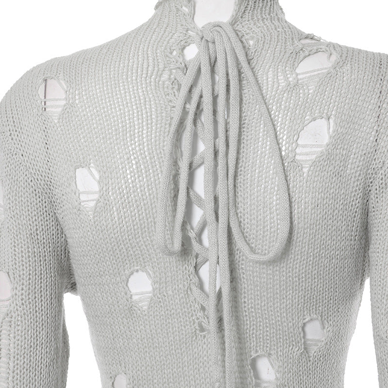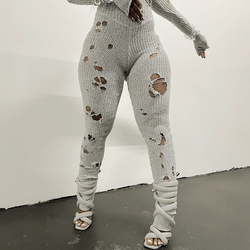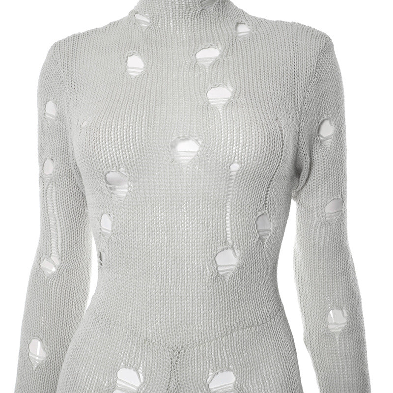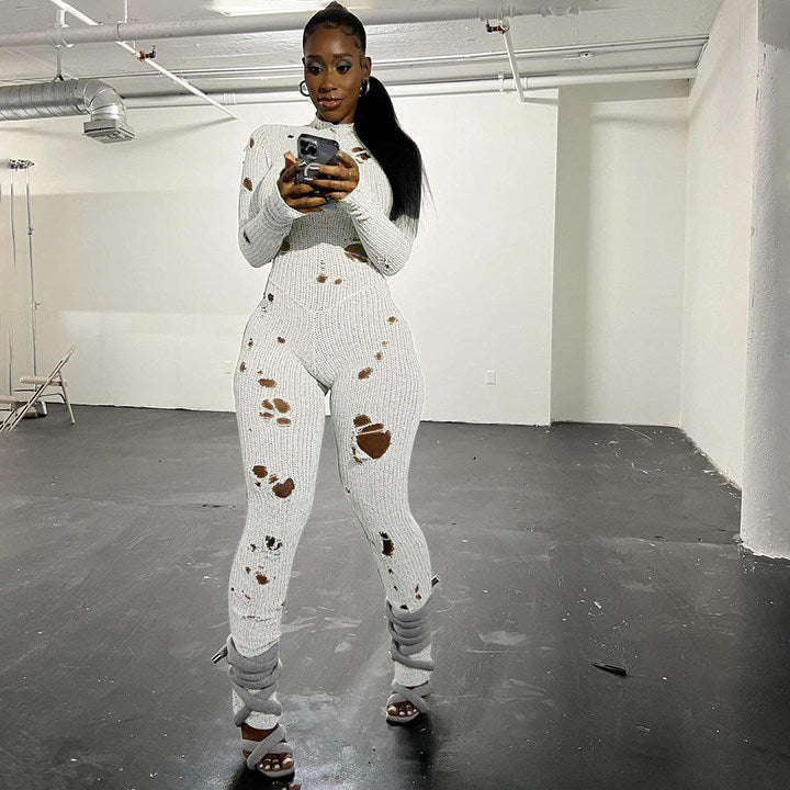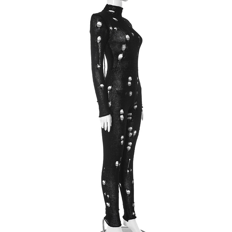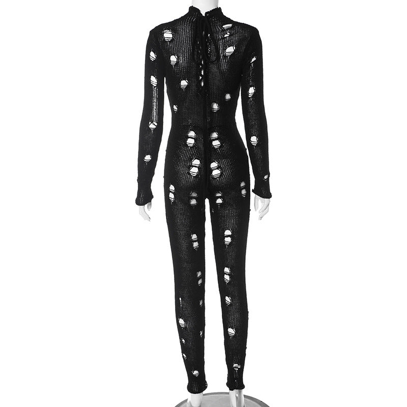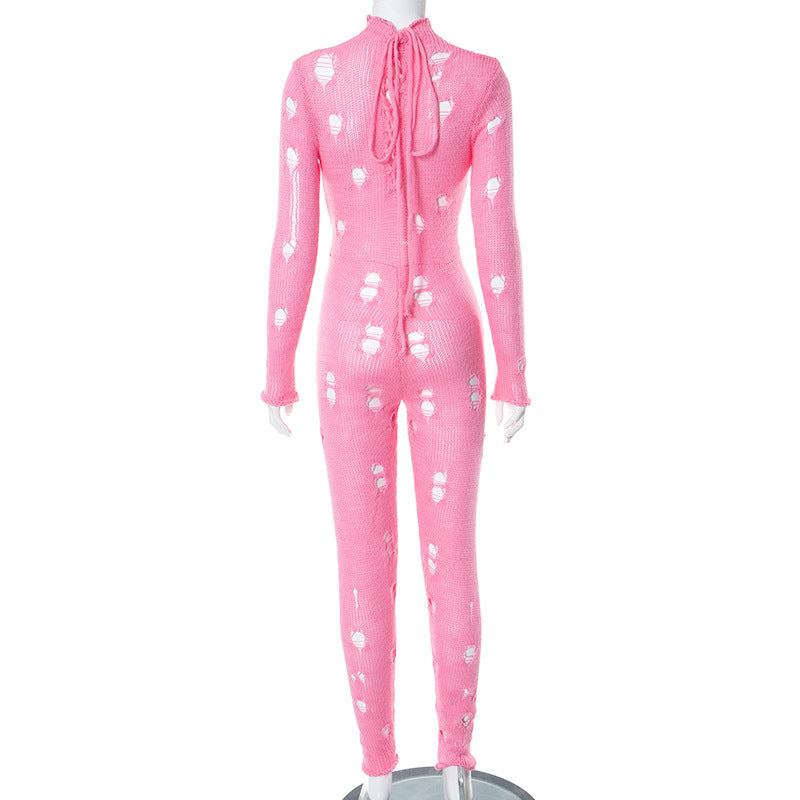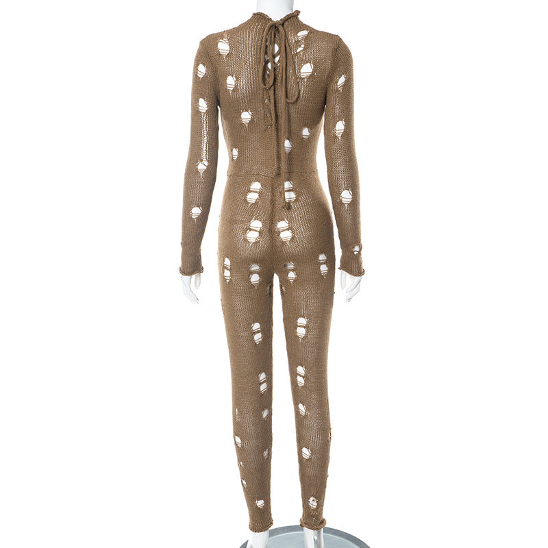 Perforated Long Sleeve Back Strap Woolen Long jumpsuit(CL12025)