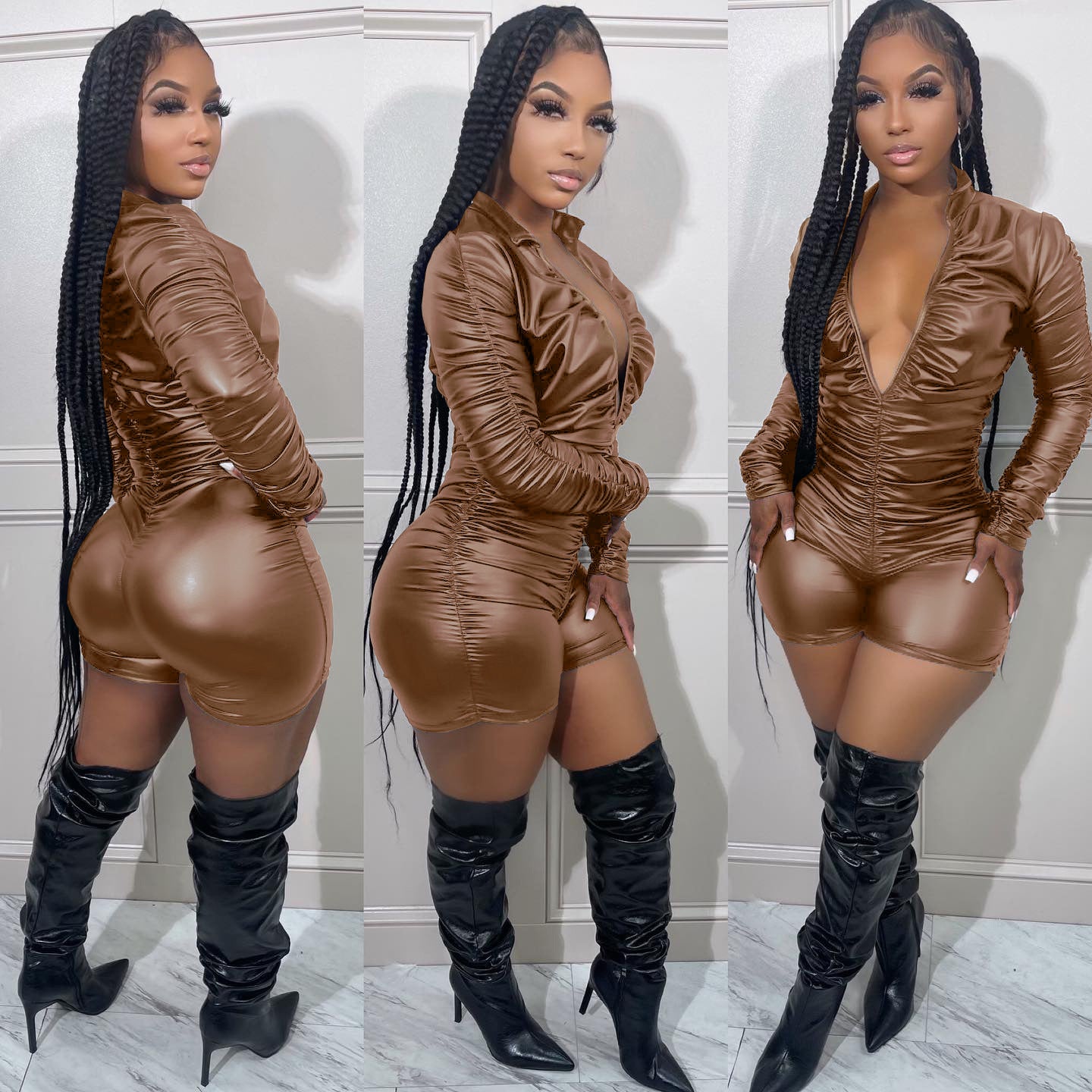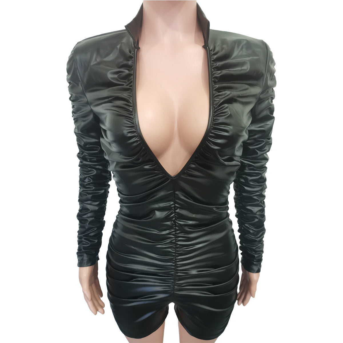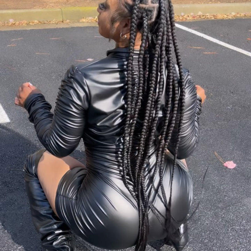 Slim-Fit Pleated High Elastic PU Leather Jumpsuit(CL11271)