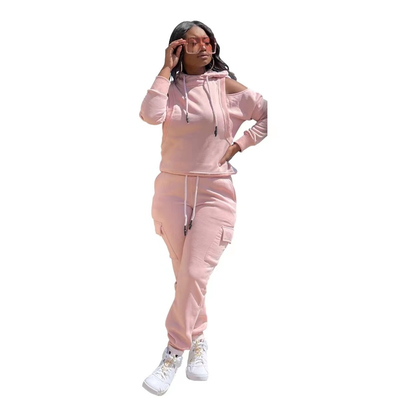 Wholesale sportswear bodysuit off shoulder running suit hooded long sleeve 2PC(CL9474)