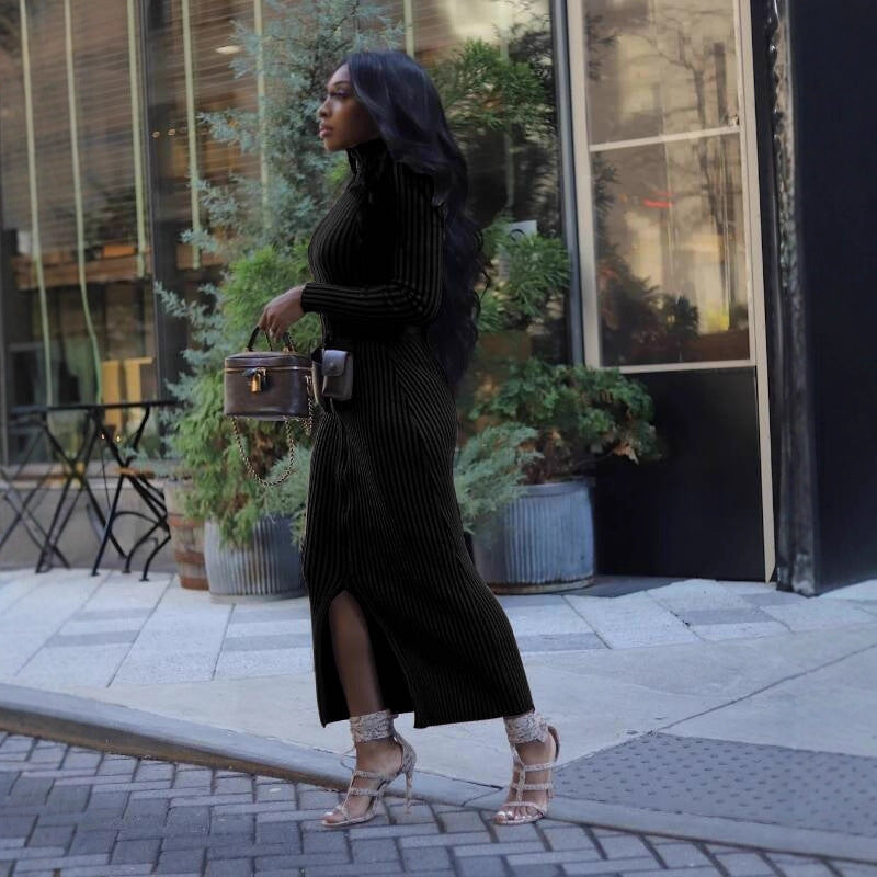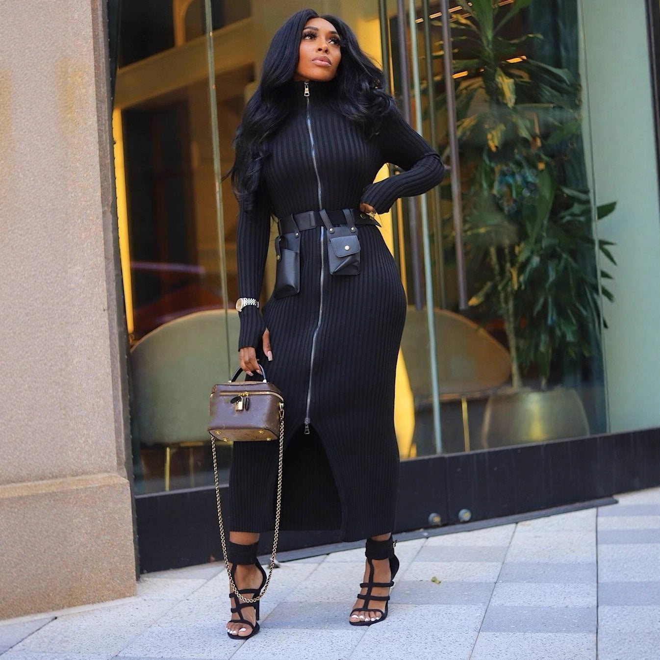 Ribbed thumb buckle long-sleeved slim-fit sexy cardigan dress with zipper (excluding belt and waist bag)(CL12375)