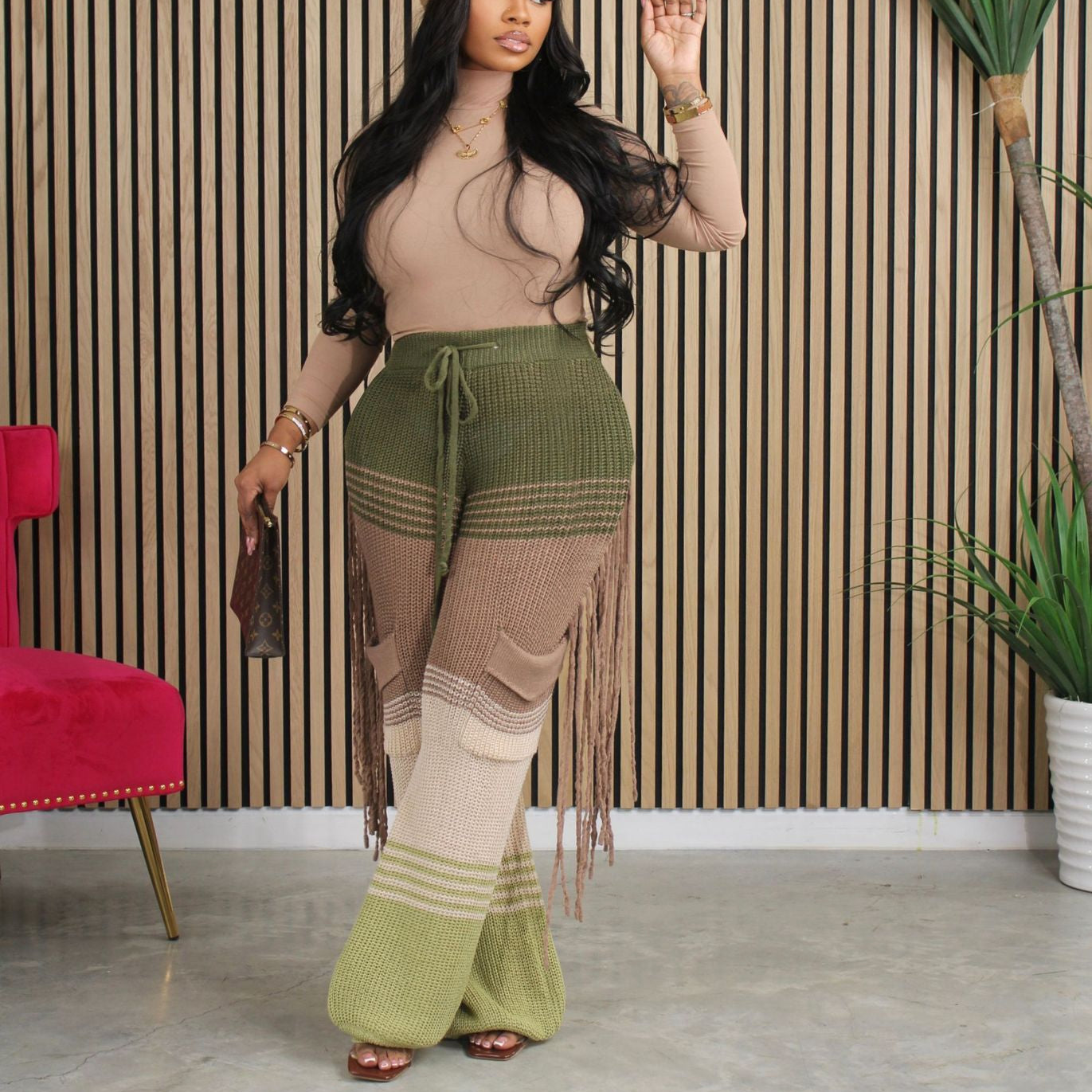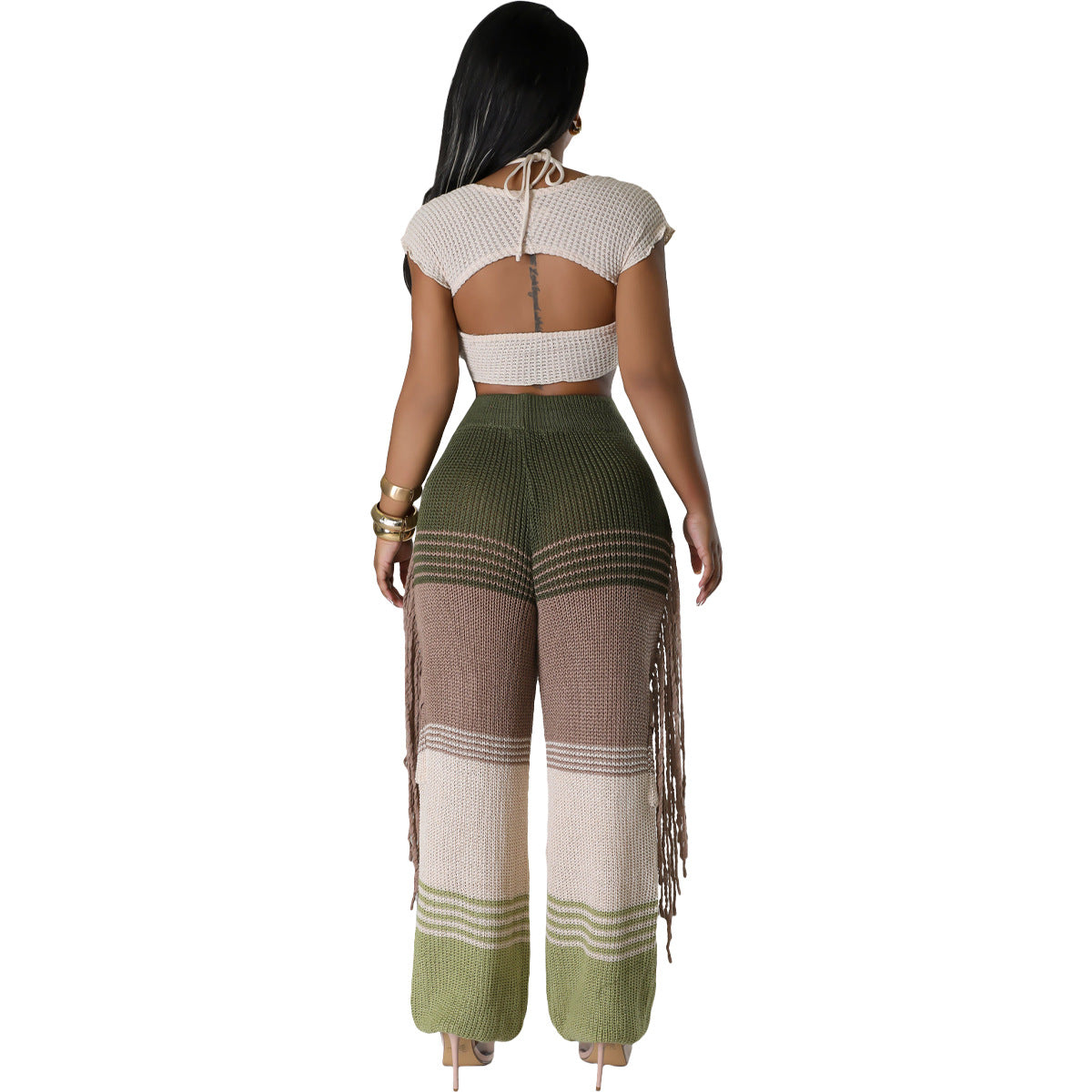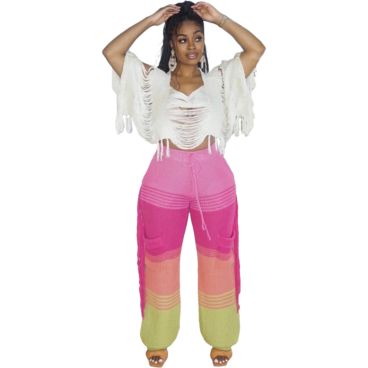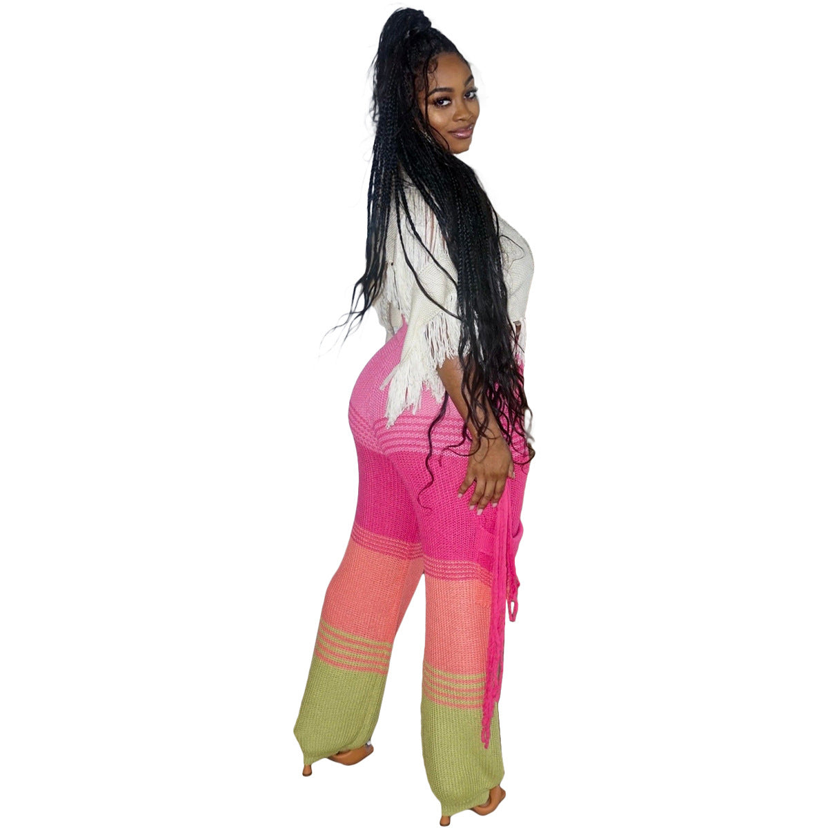 Casual knit colour-block hand-hooked tassels for loose straight-leg pants(CL12011)