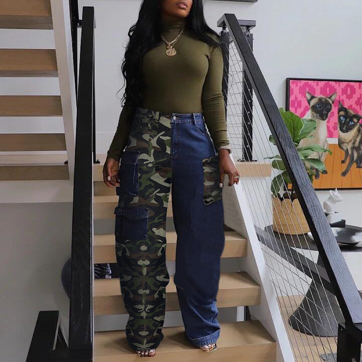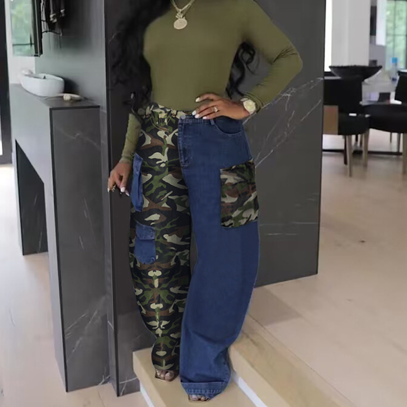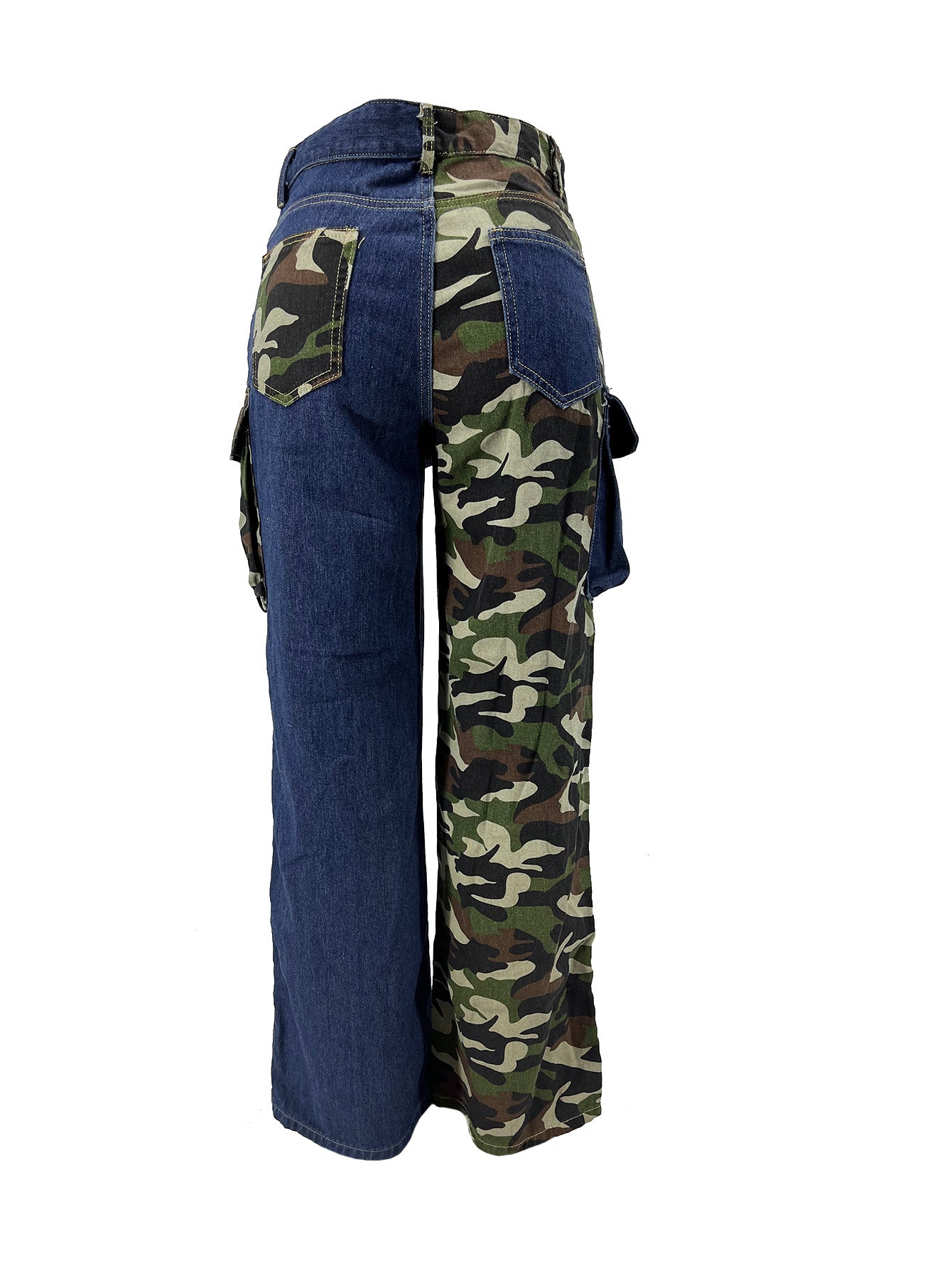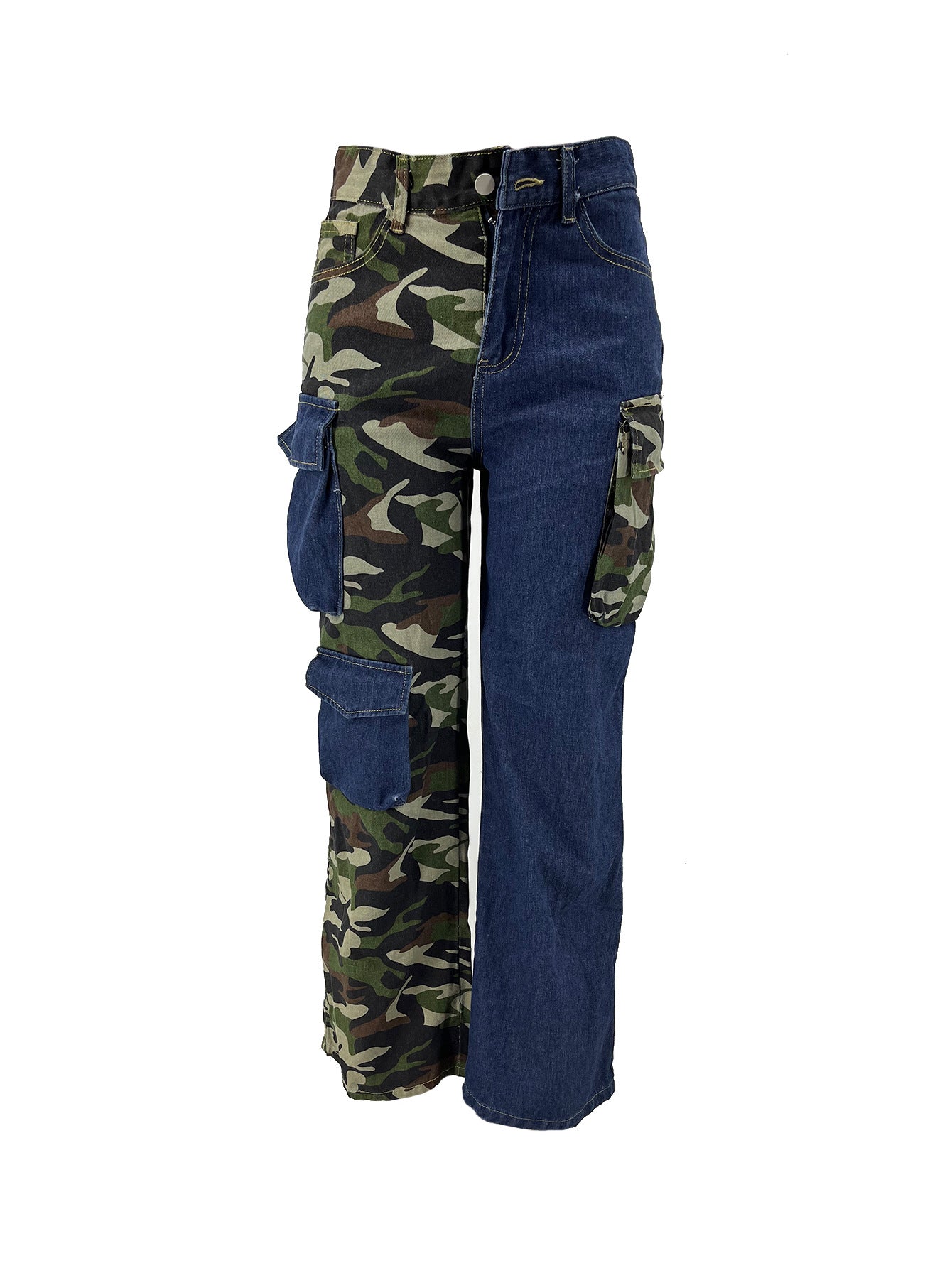 Denim patchwork camouflage three-dimensional pocket overalls(CL12048)