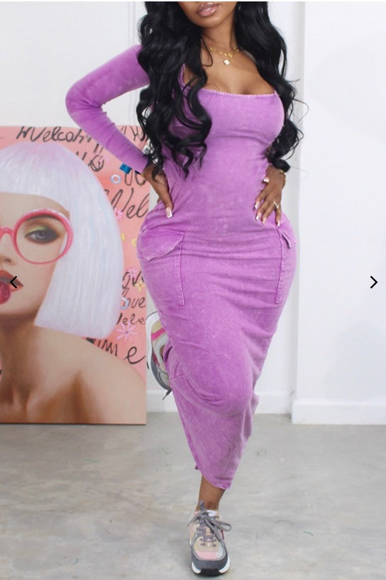 Long sleeved printed large pocket back slit wrap buttocks dress(CL12053)
