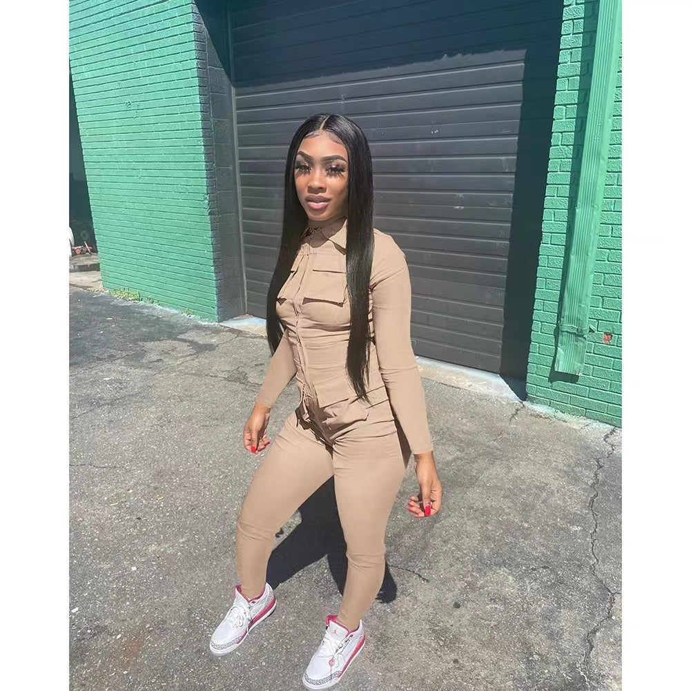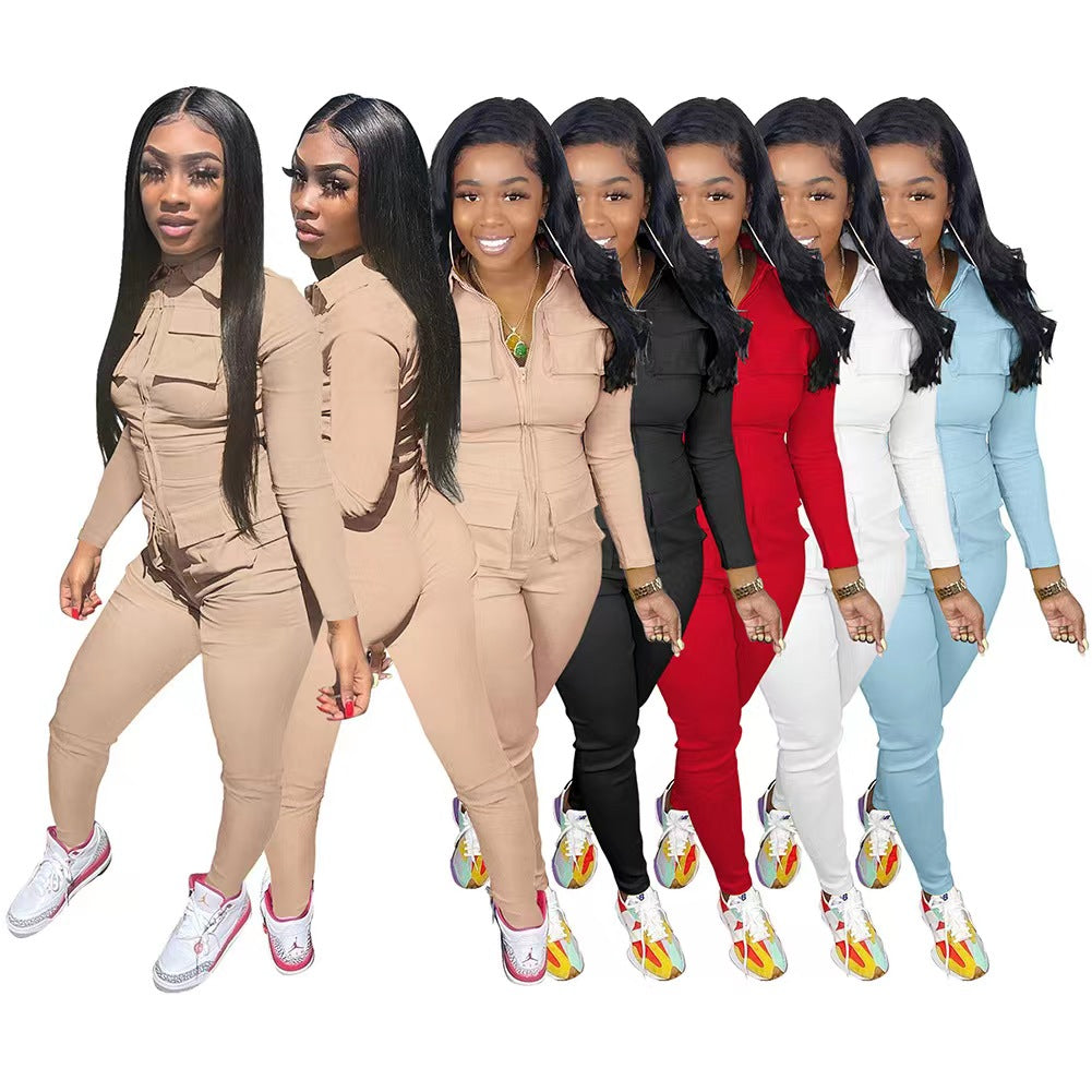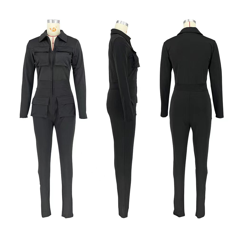 Long solid color cargo zippered pocket jumpsuit(CL12074)