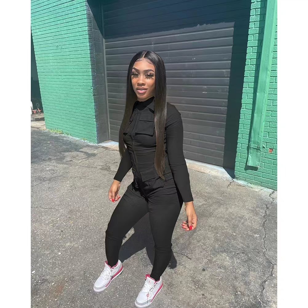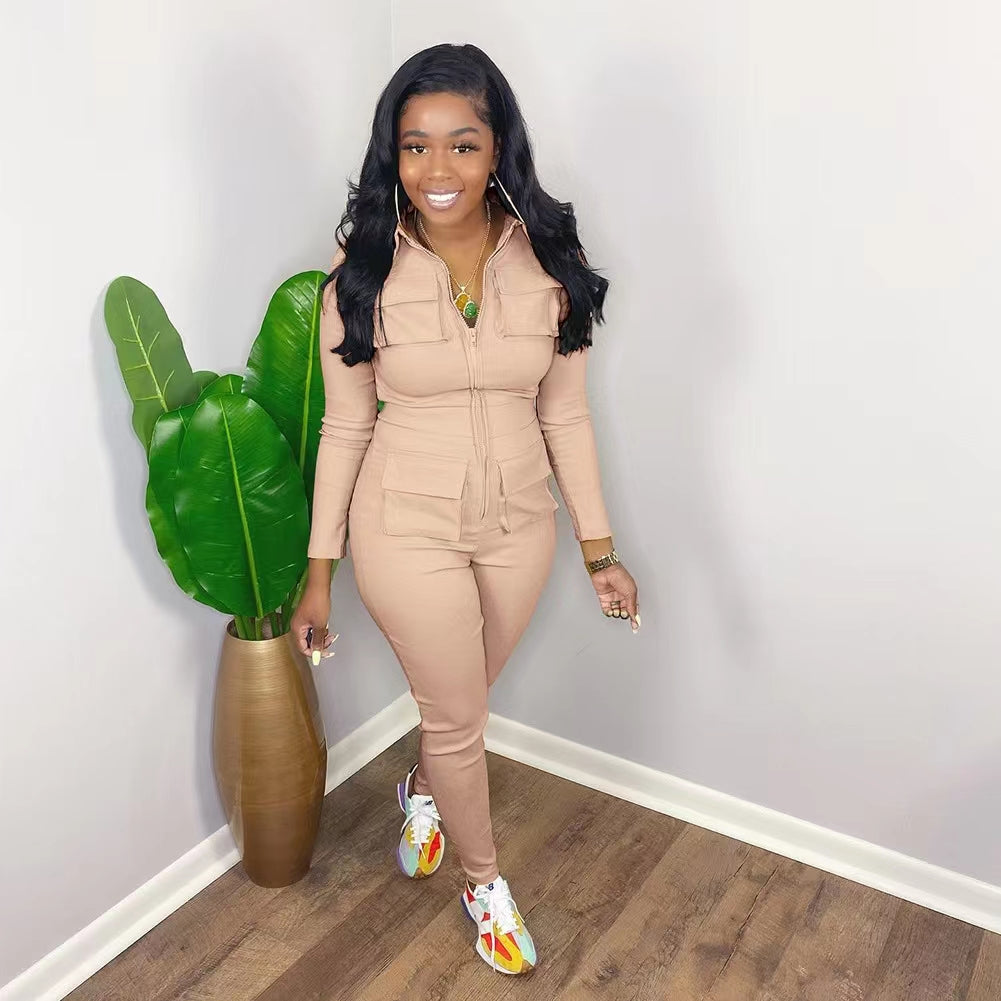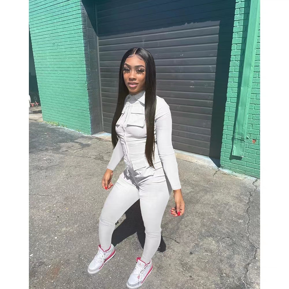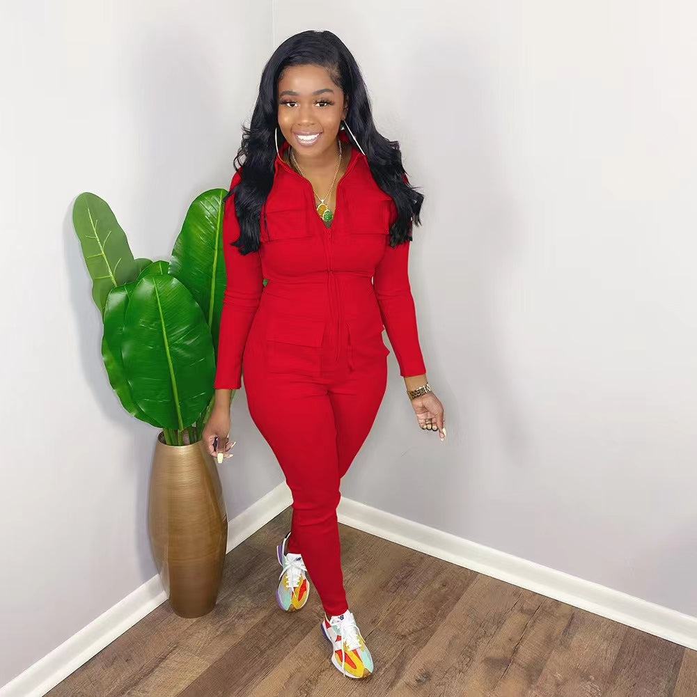 Long solid color cargo zippered pocket jumpsuit(CL12074)