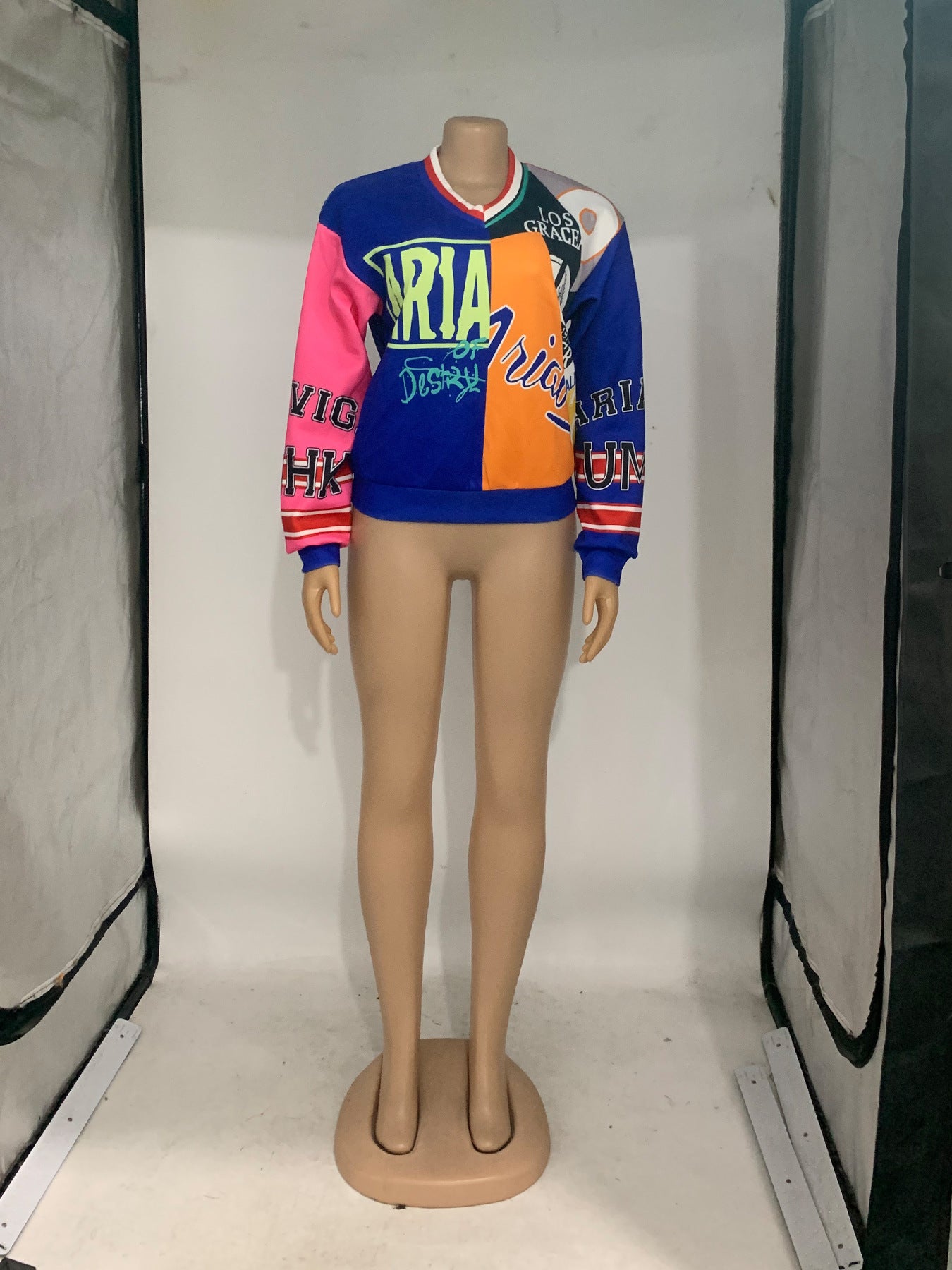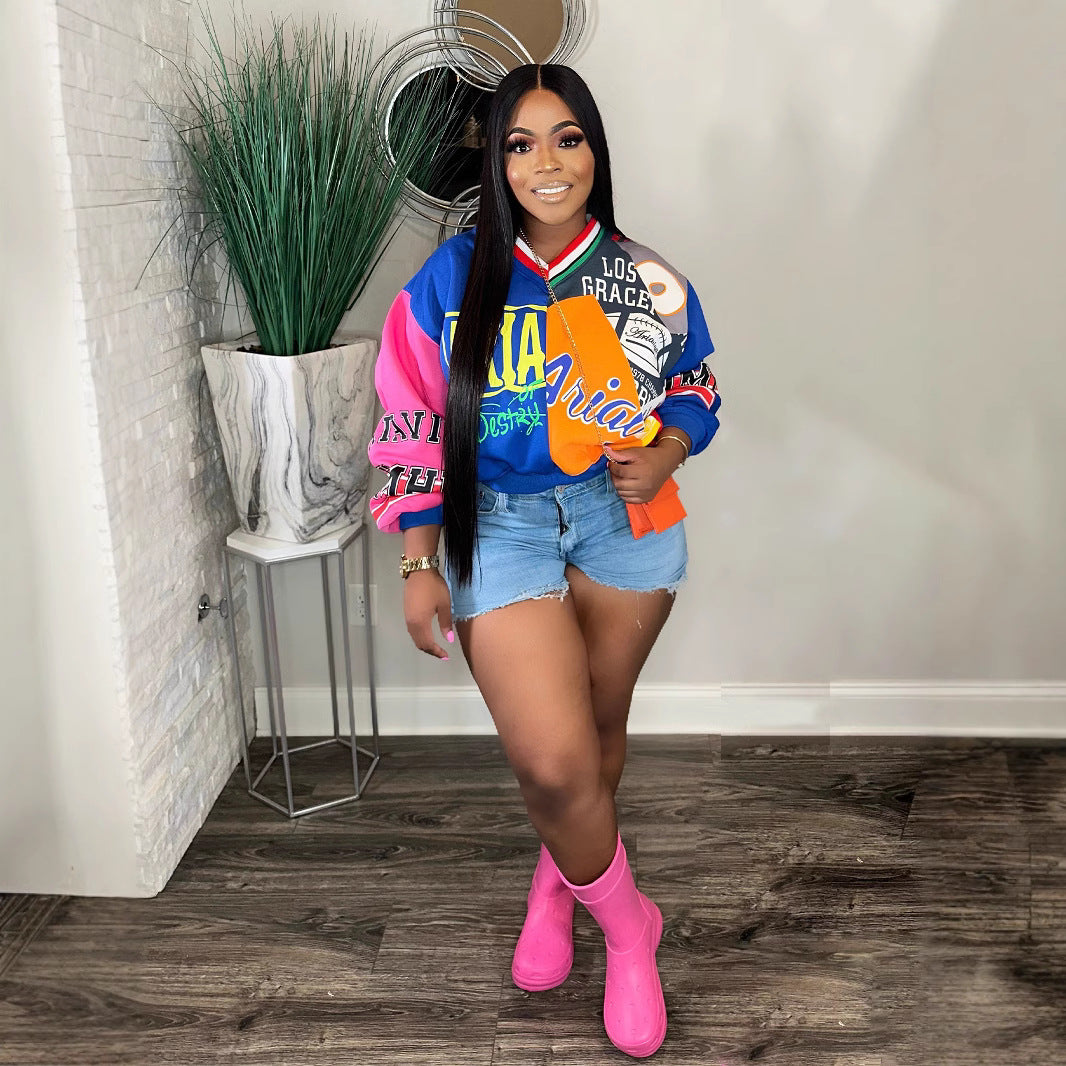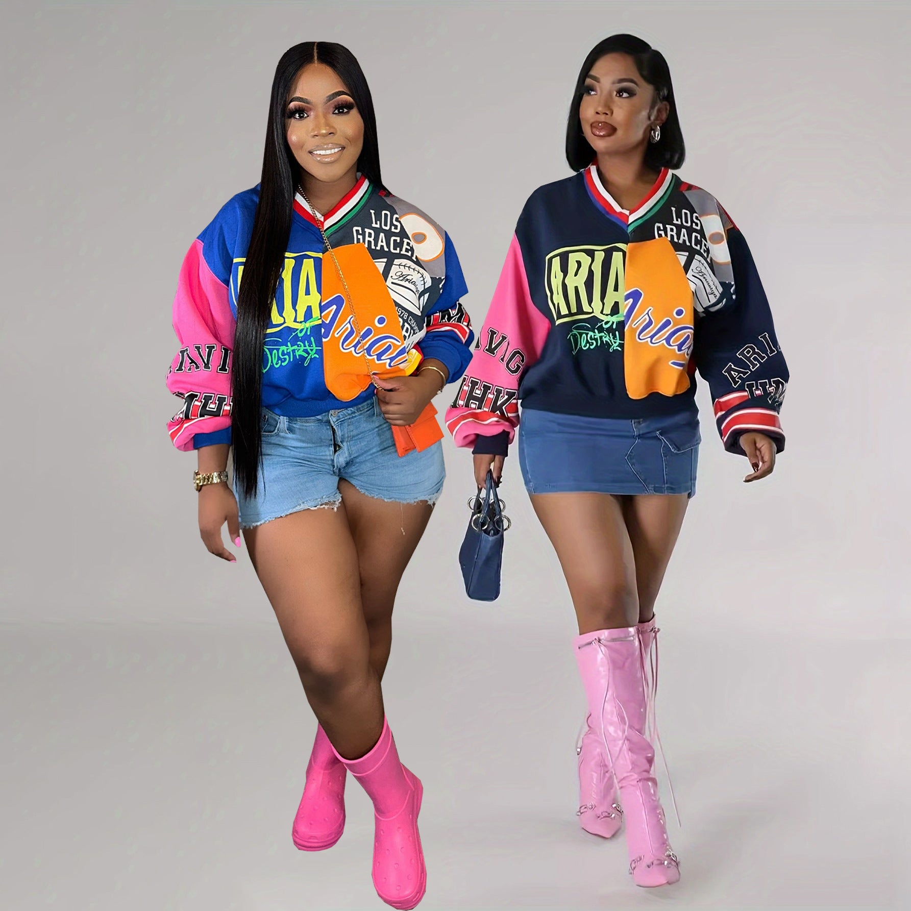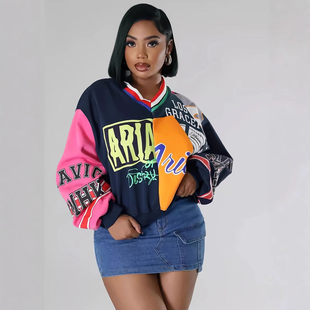 Trendy color-blocked letter print loose-fitting casual V-neck sweatshirt(CL12378)